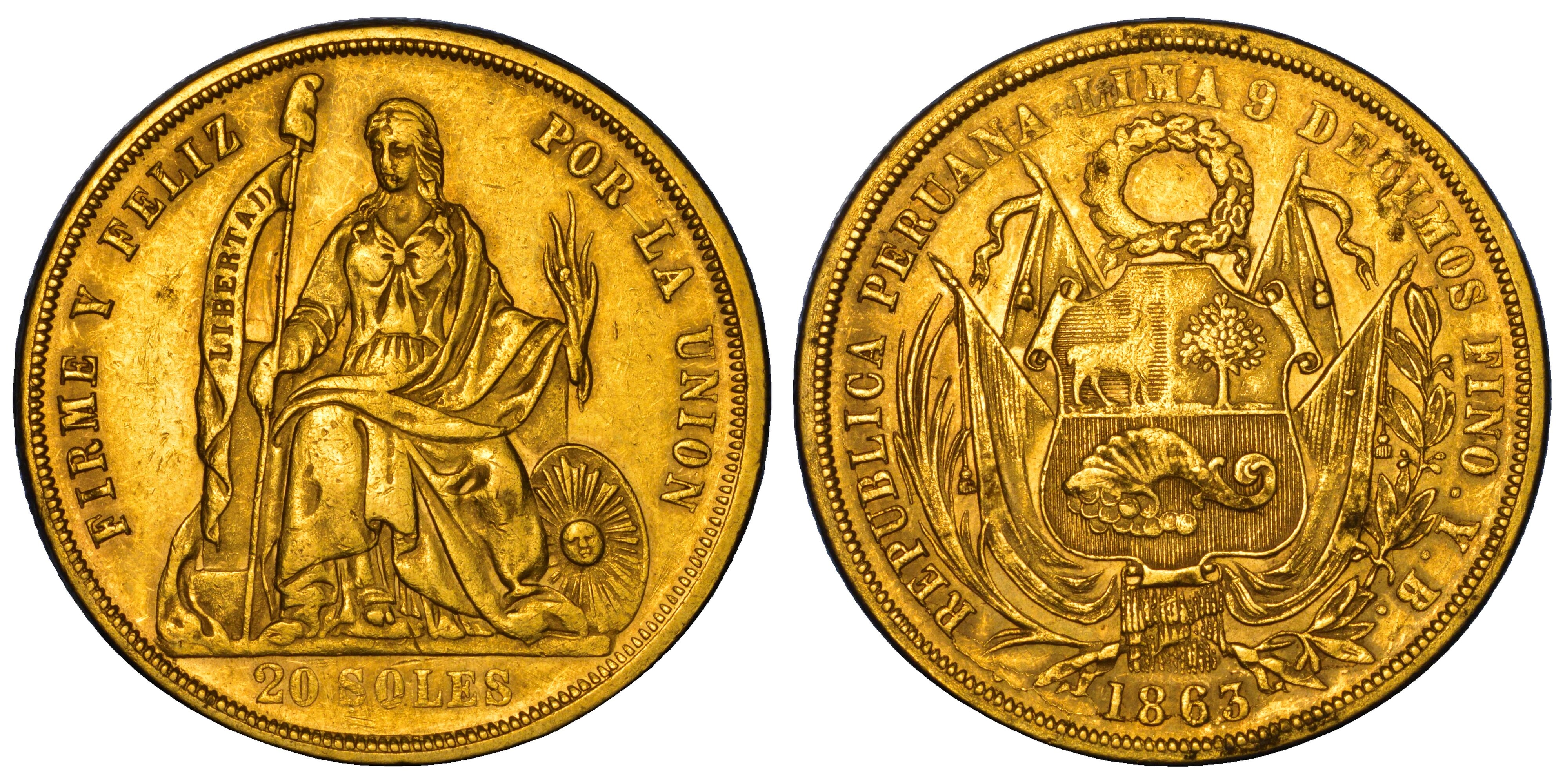 PERÙ. REPUBLICA, dal 1822. 20 Soles 1863 YB. Lima.