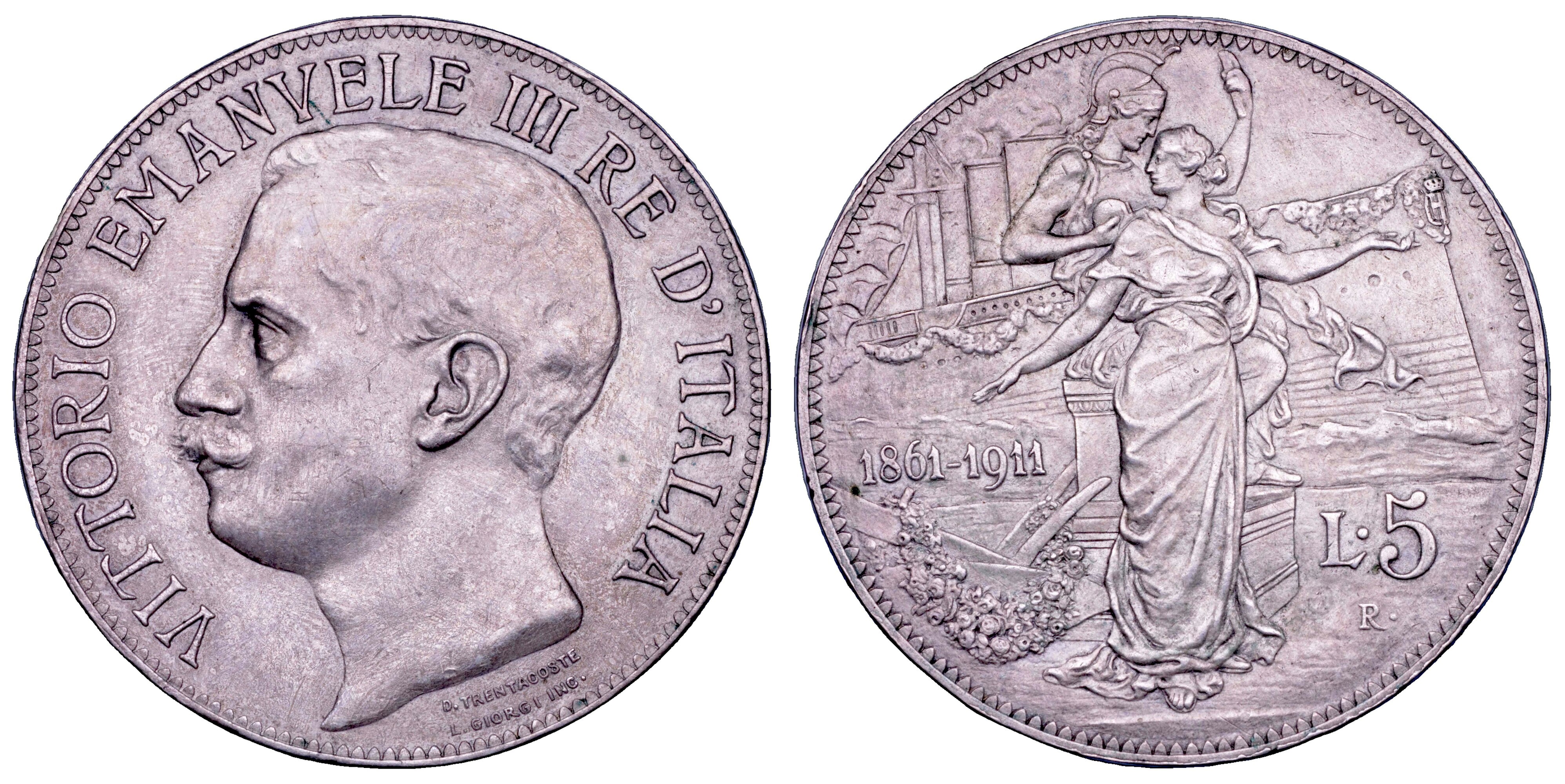 REGNO D'ITALIA. VITTORIO EMANUELE III DI SAVOIA, 1900-1946. 5 Lire 1911. Cinquantenario.
