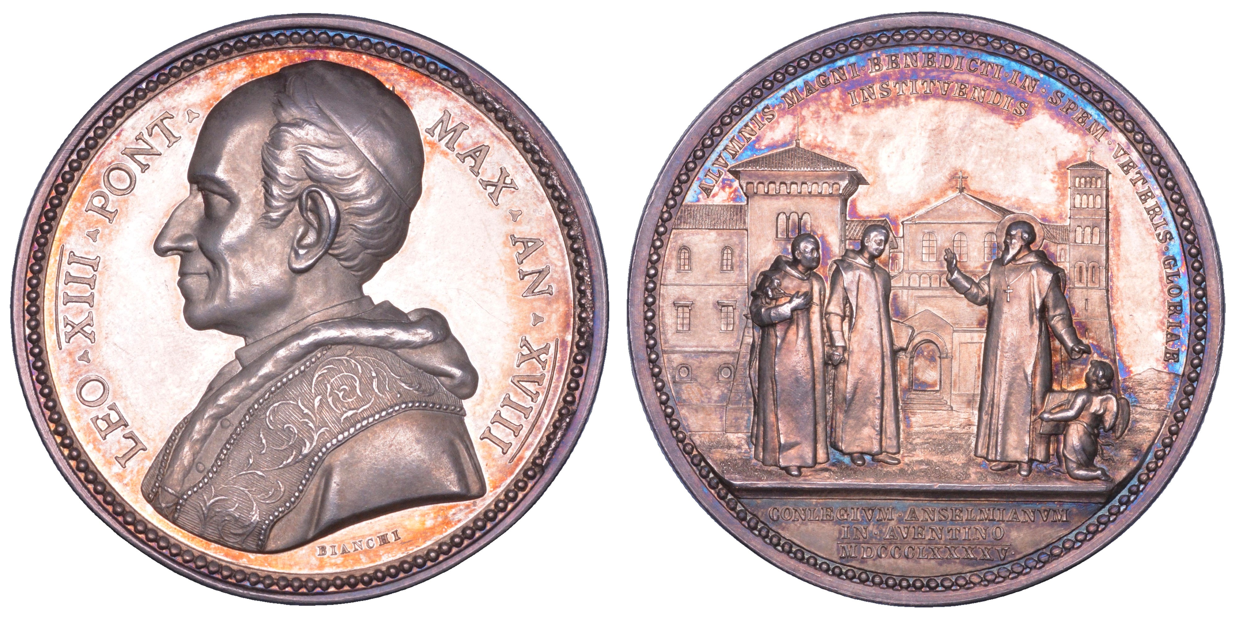 LEO XIII PONT MAX AN XVIII Busto a s. con zucchetto, mozzetta e stola. R/ ALVMNIS MAGNI BENEDICTI IN SPEM VETERIS GLORIAE INSTITVENDIS. Sant' Anselmo impartisce la benedizione a due benedettini; a d., un Angelo inginocchiato con libro; dietro, il collegio Anselmiano; in esergo, CONLEGIVM ANSELMIANVM IN AVENTINO MDCCCLXXXXV. Opus F. Bianchi. Modesti 362. Bart. E895. Rara. g. 35,56. Diam. mm. 43,61. Arg. q.FDC