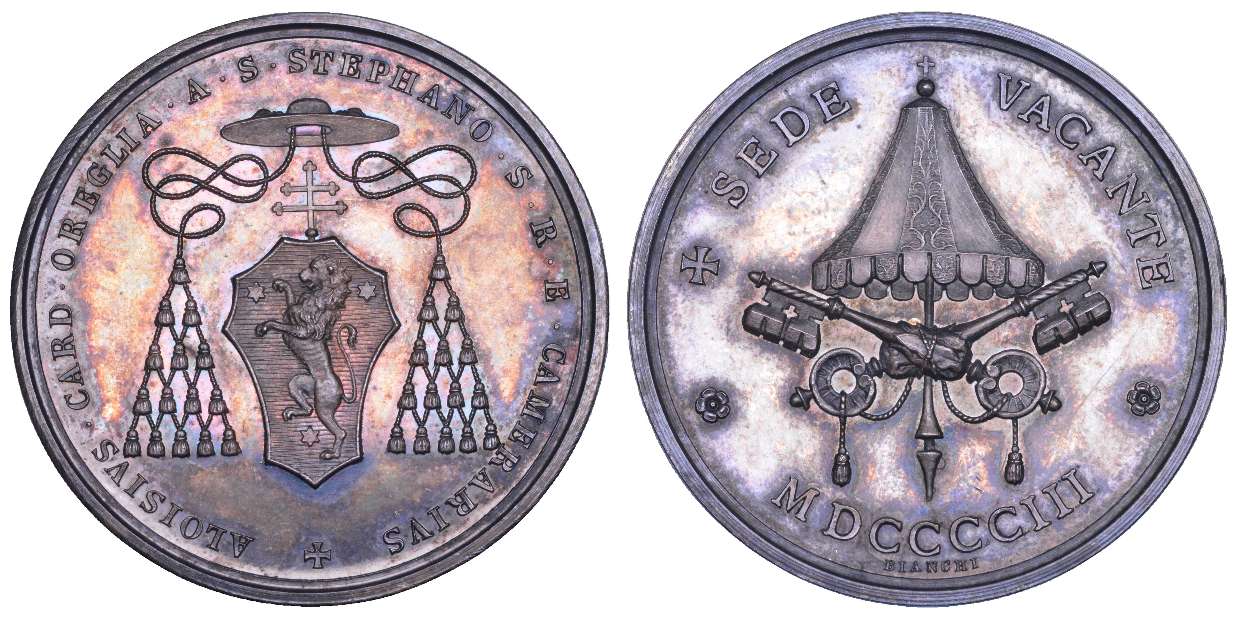 Stemma del Cardinale Luigi Oreglia di S. Stefano. R/ SEDE VACANTE MDCCCCIII Padiglione con chiavi decussate. Opus F. Bianchi. Boccia 109. Bartolotti p. 328. Patrignani 155. Molto rara. g. 22,69. Diam. mm. 38,72. Arg. Patina scura di medagliere. q.FDC