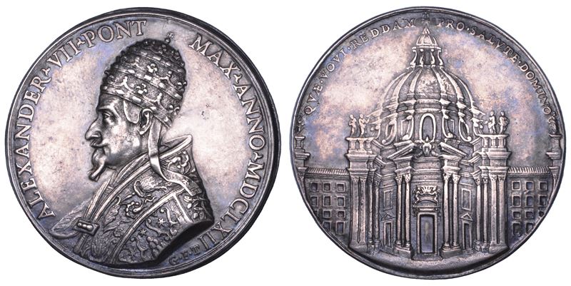 ALEXANDER VII PONT MAX ANNO MDCLXII Busto a s. con triregno e piviale ornato. R/ QVÆ VOVI REDDAM PRO SALVTE DOMINO La facciata della chiesa di Santa Maria in Campitelli secondo il progetto dell'architetto Rainaldi. Opus Gioacchino Francesco Travani. Patrignani VIII/6. Miselli 594 (questo esemplare pubblicato). Estremamente rara. g. 132,00. Diam. mm. 71,25. Arg. Fusione originale. q.SPL