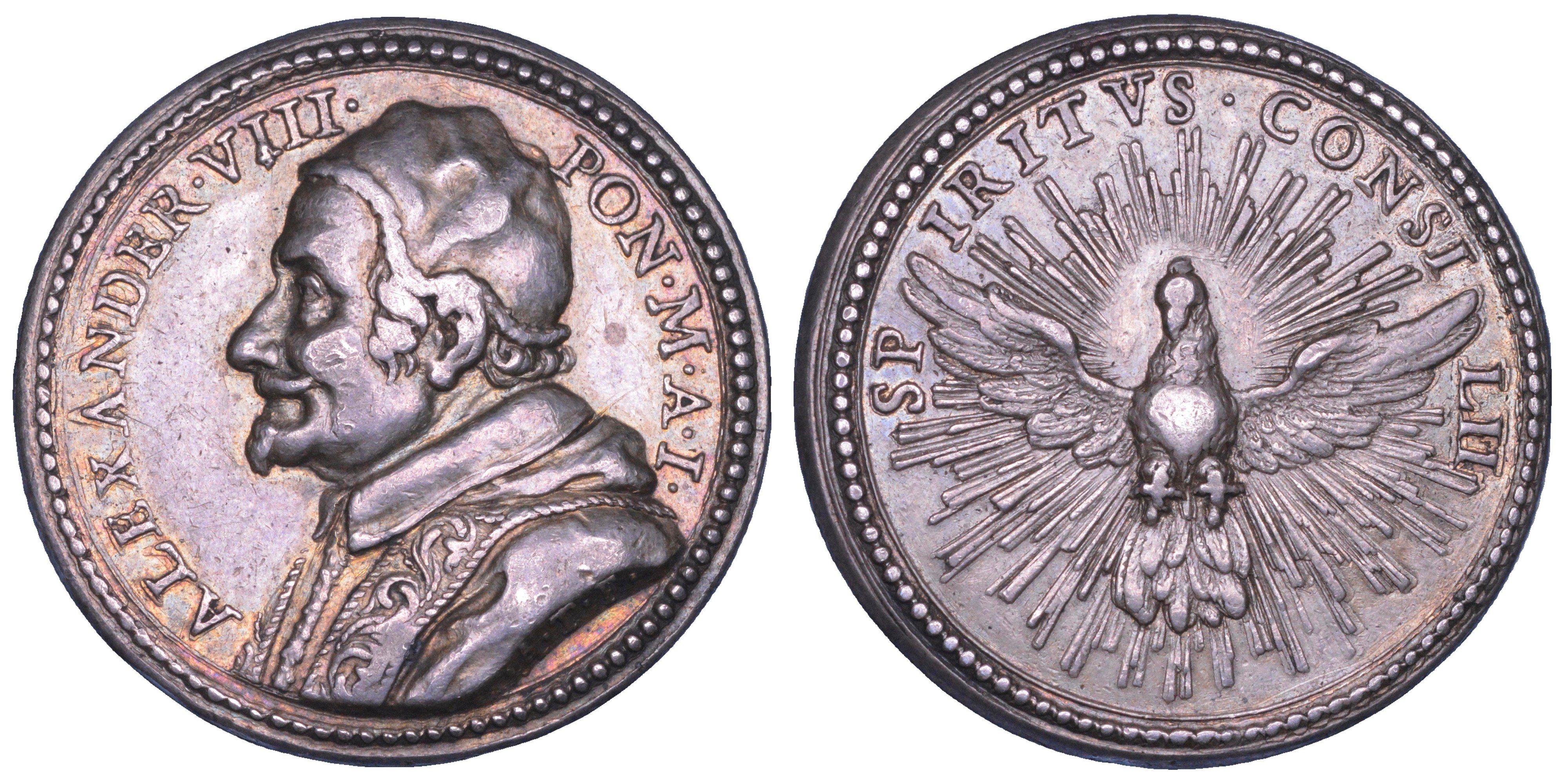 ALEXANDER VIII PON M A I Busto del Papa a s. con camauro, mozzetta e stola ornata. R/ SPIRITVS CONSILII Colomba dello Spirito Santo raggiante. Opus Antonio Travani. Miselli 259. g. 12,96. Diam. mm. 31,19. Arg. buon BB