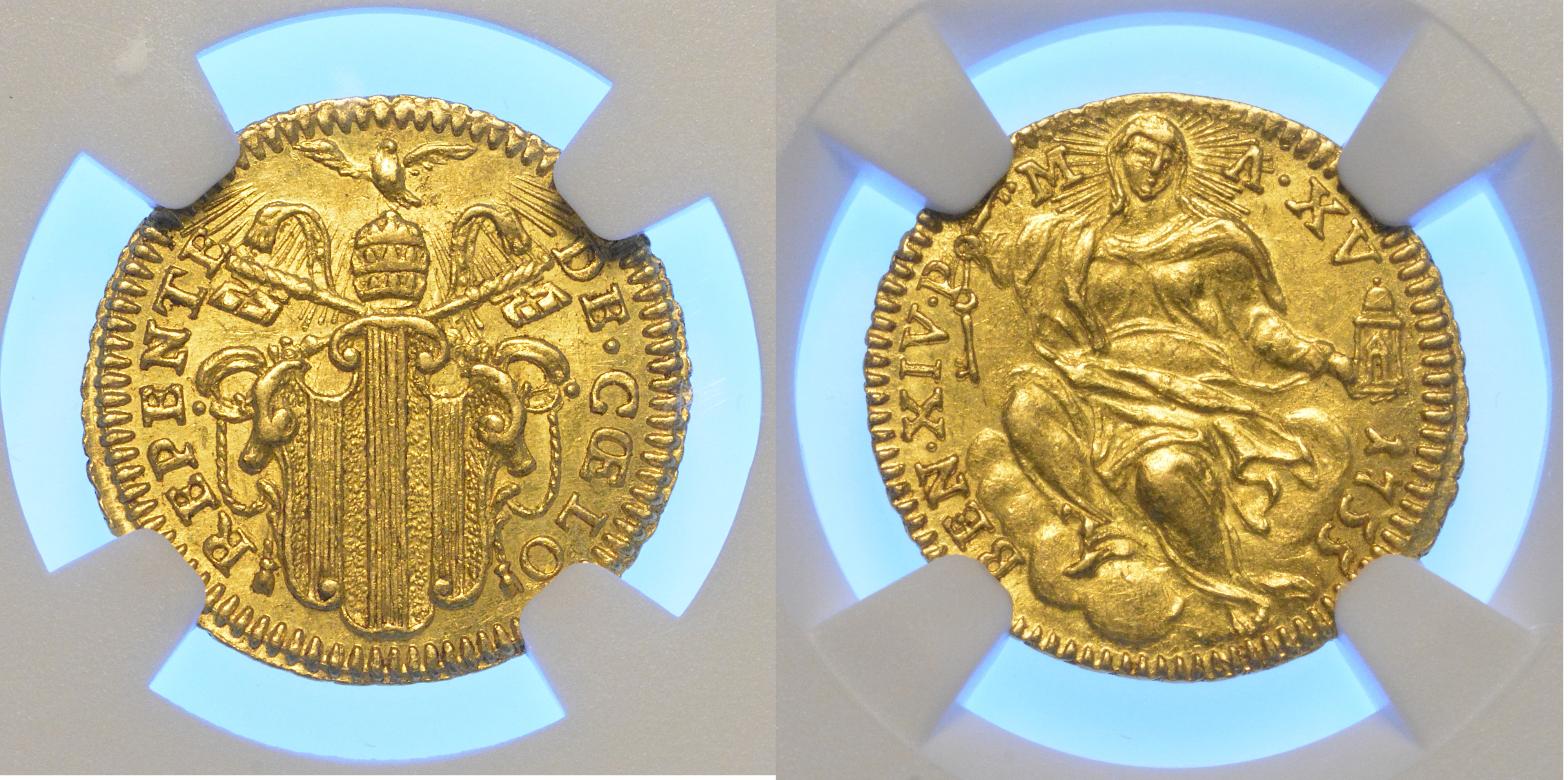 STATO PONTIFICIO. BENEDETTO XIV, 1740-1758. Mezzo zecchino anno XV/1755.