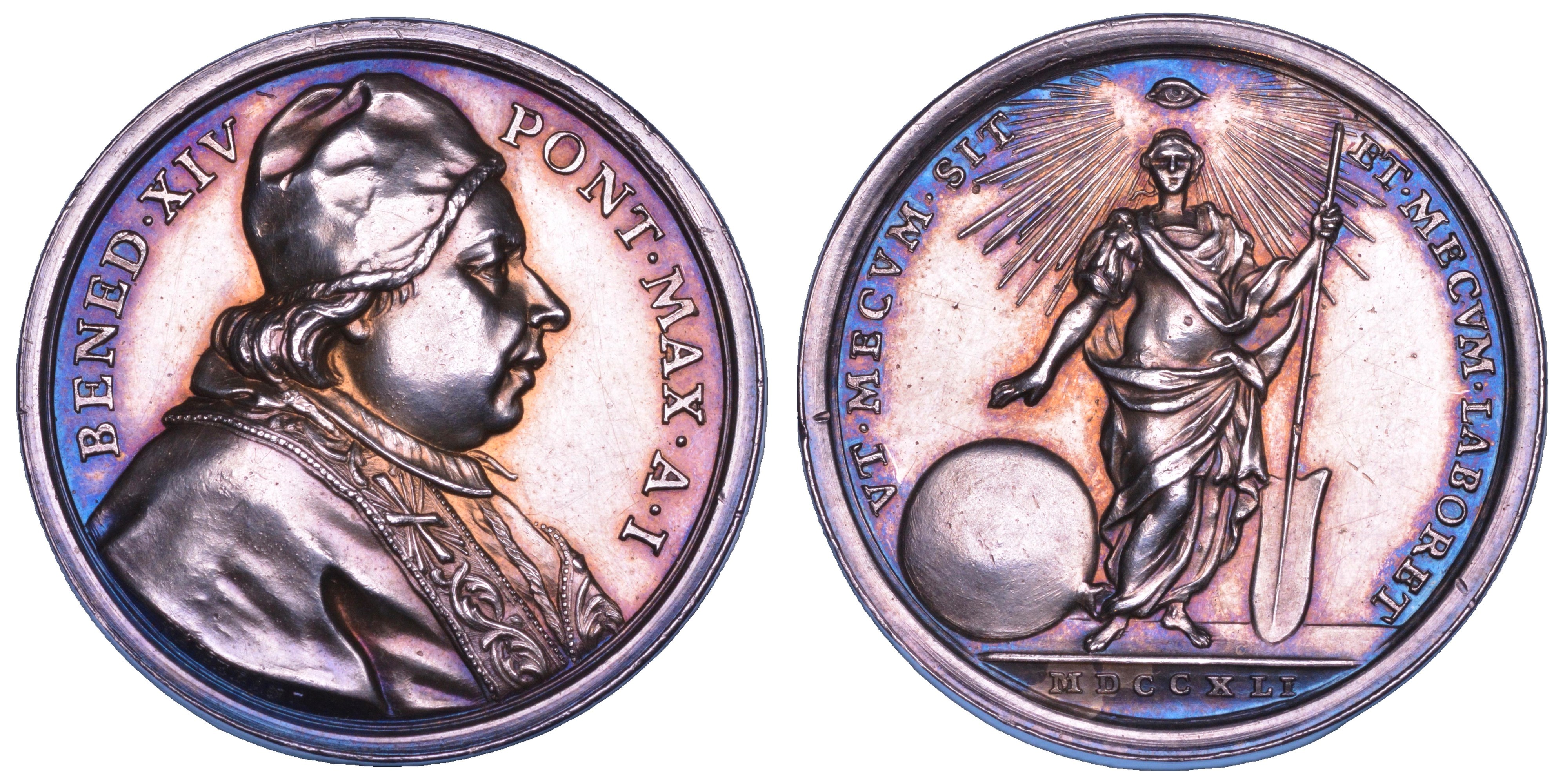BENED XIV PONT MAX A I. Busto a d. con camauro, mozzetta e stola. R/ VT MECVM SIT ET MECVM LABORET Personificazione della provvidenza con globo e timone. Patrignani 8c. Molto rara. g. 13,87. Diam. mm. 32,09. Arg. Lievi graffi. Piacevole lieve iridescenza. SPL