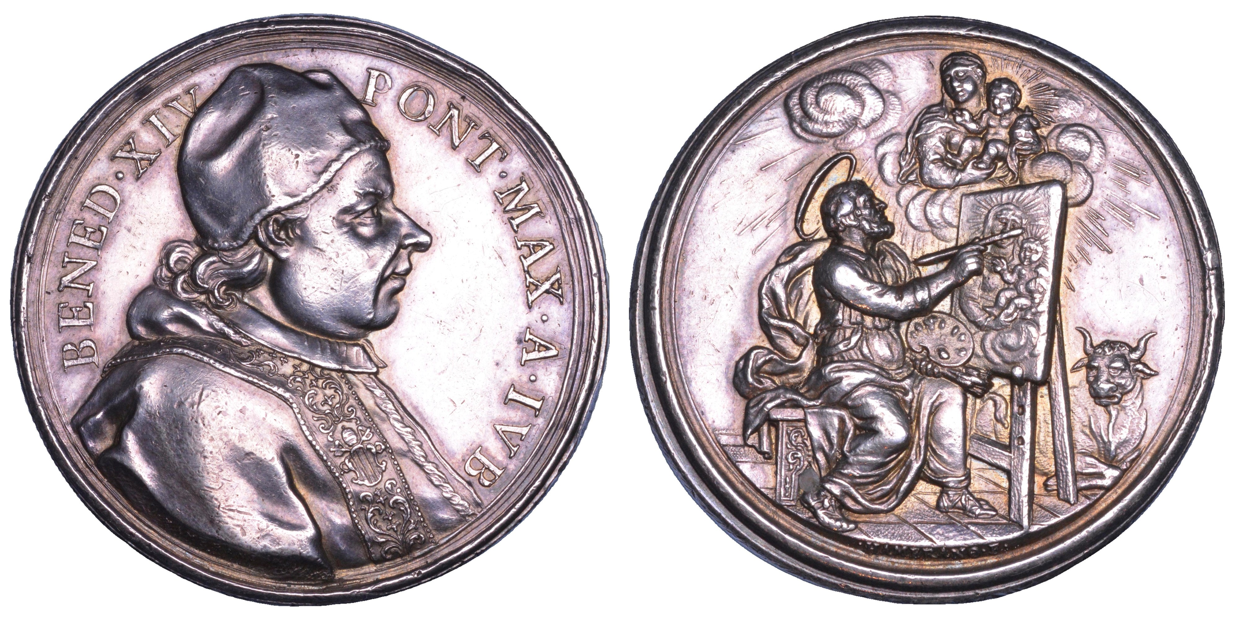 BENED XIV PONT MAX A IVB Busto a d. con camauro, mozzetta e stola. R/ San Luca siede a d. davanti al cavalletto e ritrae su tavola la Madonna col Bambino fluttuanti tra le nuvole, dietro la tavola, un toro accovacciato in cornice esterna. Opus Ermenegildo o Ottone Hamerani. Inedita ? Estremamente rara. g. 38,85. Diam. mm. 44,34. Arg. Colpi. migliore di BB