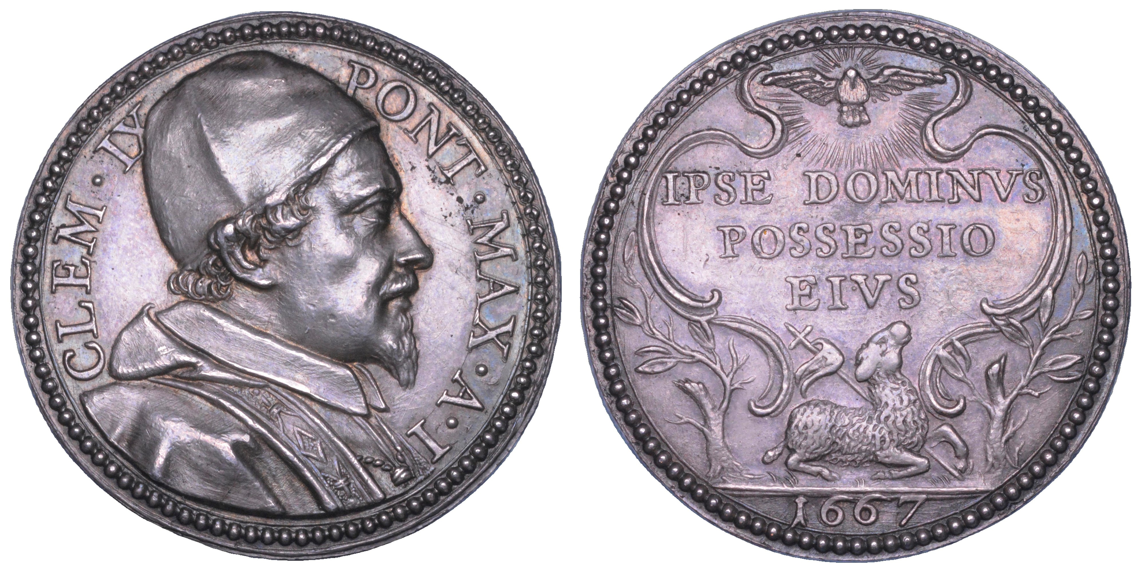 CLEM IX PONT MAX A I Busto a d. con camauro, mozzetta e stola. R/ Entro cartella aperta, IPSE DOMINVS POSSESSIO EIVS Agnus Dei accovacciato tra due alberi d'ulivo; in alto la Santa Colomba raggiante. Opus Gaspare Morone (?). Miselli, 680 (Riconiazione posteriore ?). Molto rara. g. 15,69. Diam. mm. 32,28. Arg. SPL