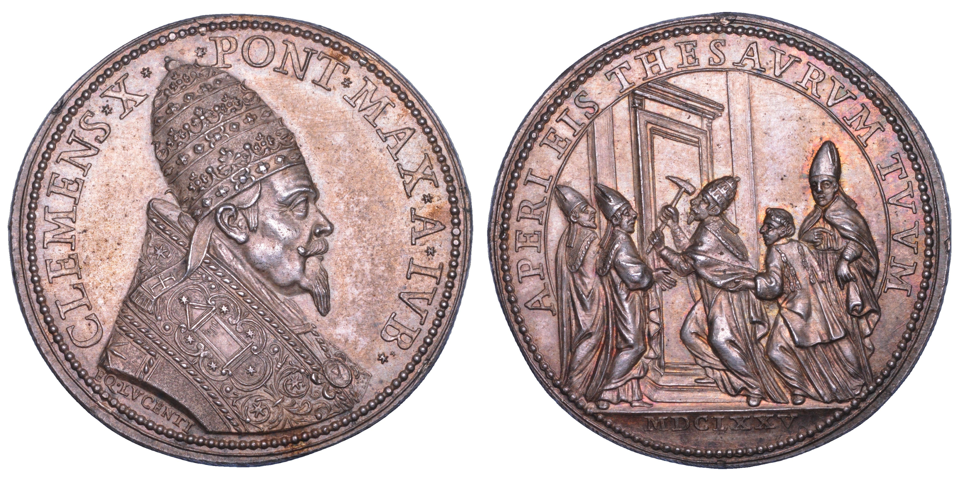 CLEMENS X PONT MAX A IVB Busto del Pontefice a d. con tiara e piviale con Porta Santa. R/ APERI EIS THESAVRVM TVVM Apertura da parte del Pontefice e prelati della Porta Santa; in esergo, MDCLXXV. Opus Girolamo Lucenti. Modesti 52. Miselli 59; Bartolotti E675. g. 27,74. Diam. mm. 40,16. Arg. Lievissima traccia di appiccagnolo. SPL