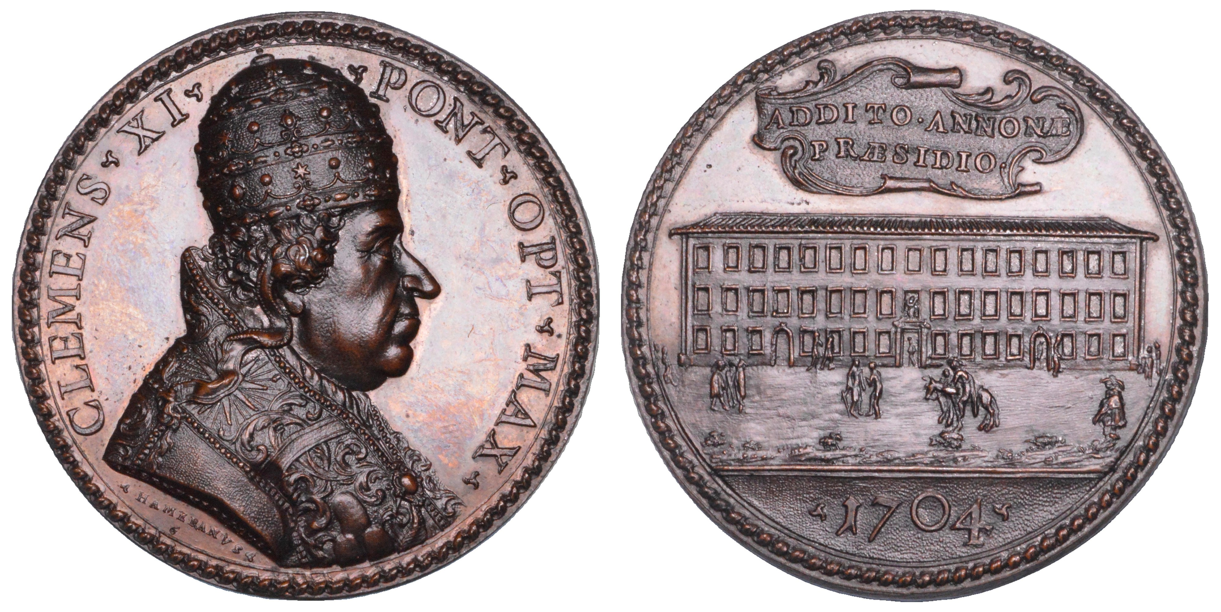 STATO PONTIFICIO. CLEMENTE XI (Giovanni Francesco Albani), 1700-1721. Medaglia in bronzo 1704 (A. IV). Il palazzo dell'Annona a Roma.