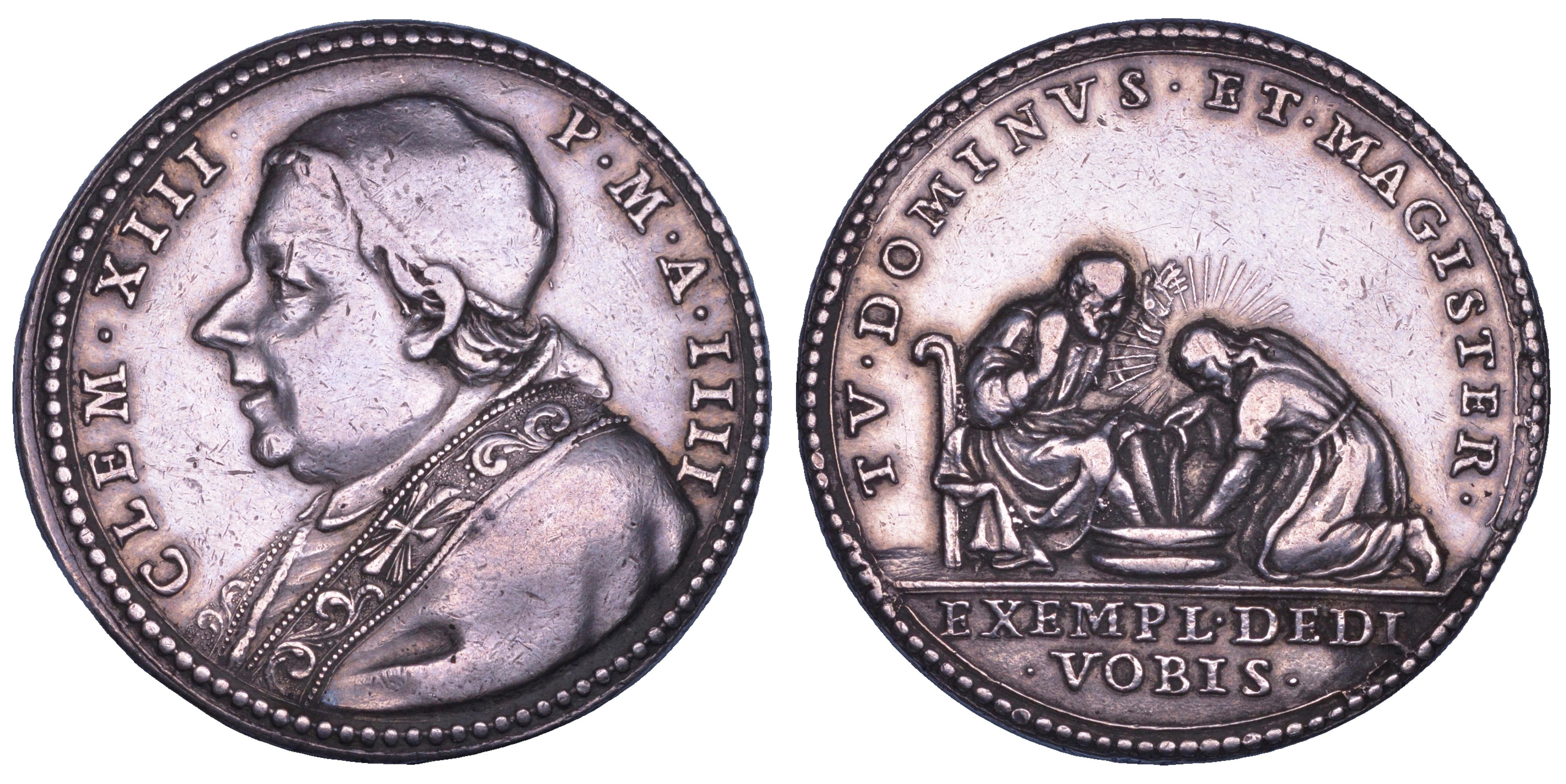 CLEM XIIII P M A IIII. Busto del Pontefice a s., con camauro, mozzetta e stola. R/ TV DOMINVS ET MAGISTER Nostro Signore lava i piedi a S. Pietro. All'esergo, EXEMPL DEDI VOBIS. Patrignani 15. Molto rara. g. 13,22. Diam. mm. 30,05. Arg. BB