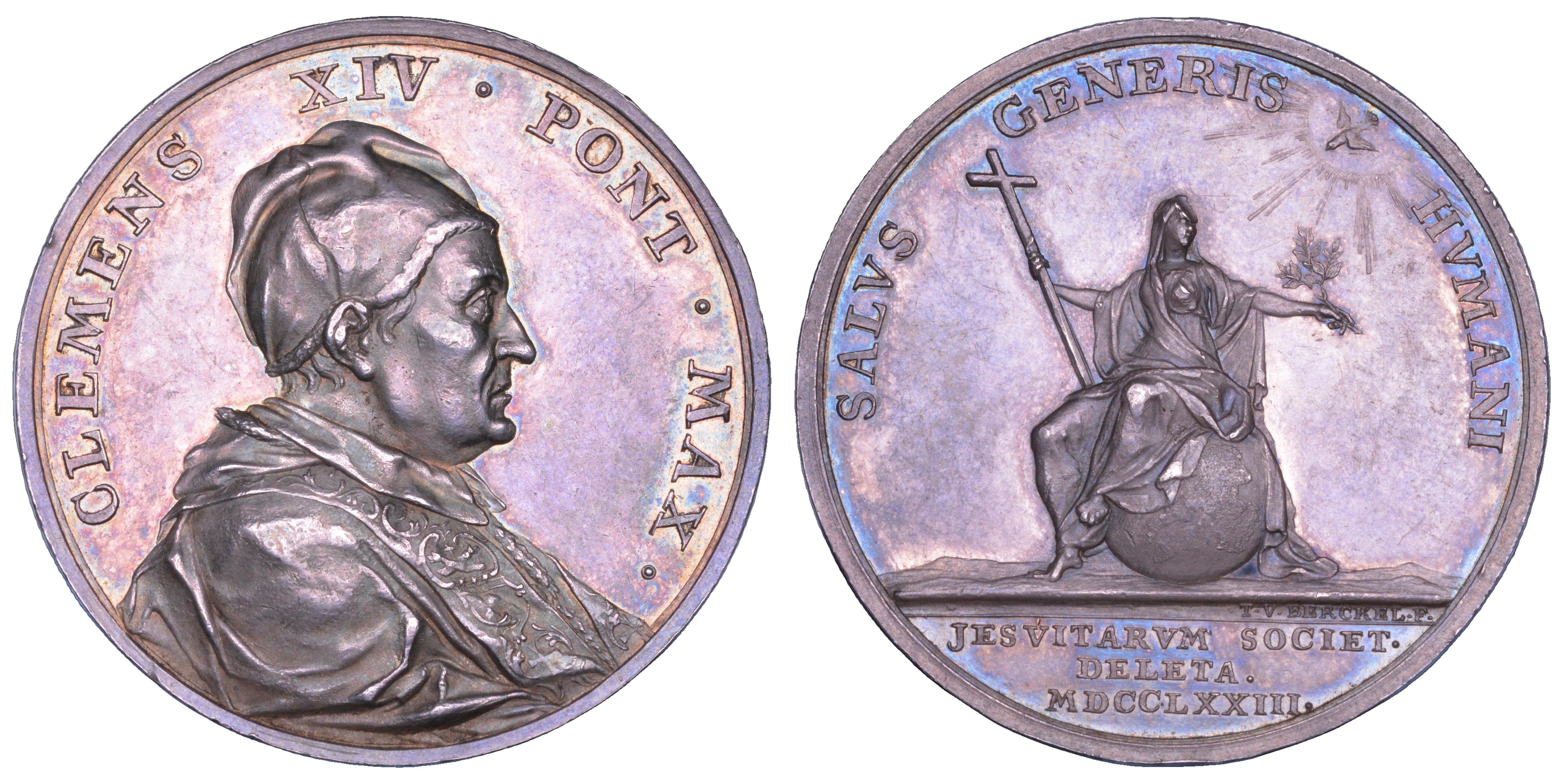 Busto del Pontefice a d. con camauro, mozzetta e stola ornata. R/ La Colomba dello Spirito Santo irradia la Chiesa seduta sopra il globo, mentre tiene con le mani una lunga croce e un rametto d'ulivo; in esergo, JESVITARVM SOCIET DELETA MDCCLXXIII. Opus T. V. Berkel. Patrignani 20. g. 21,64. Diam. mm. 39,11. Arg. SPL