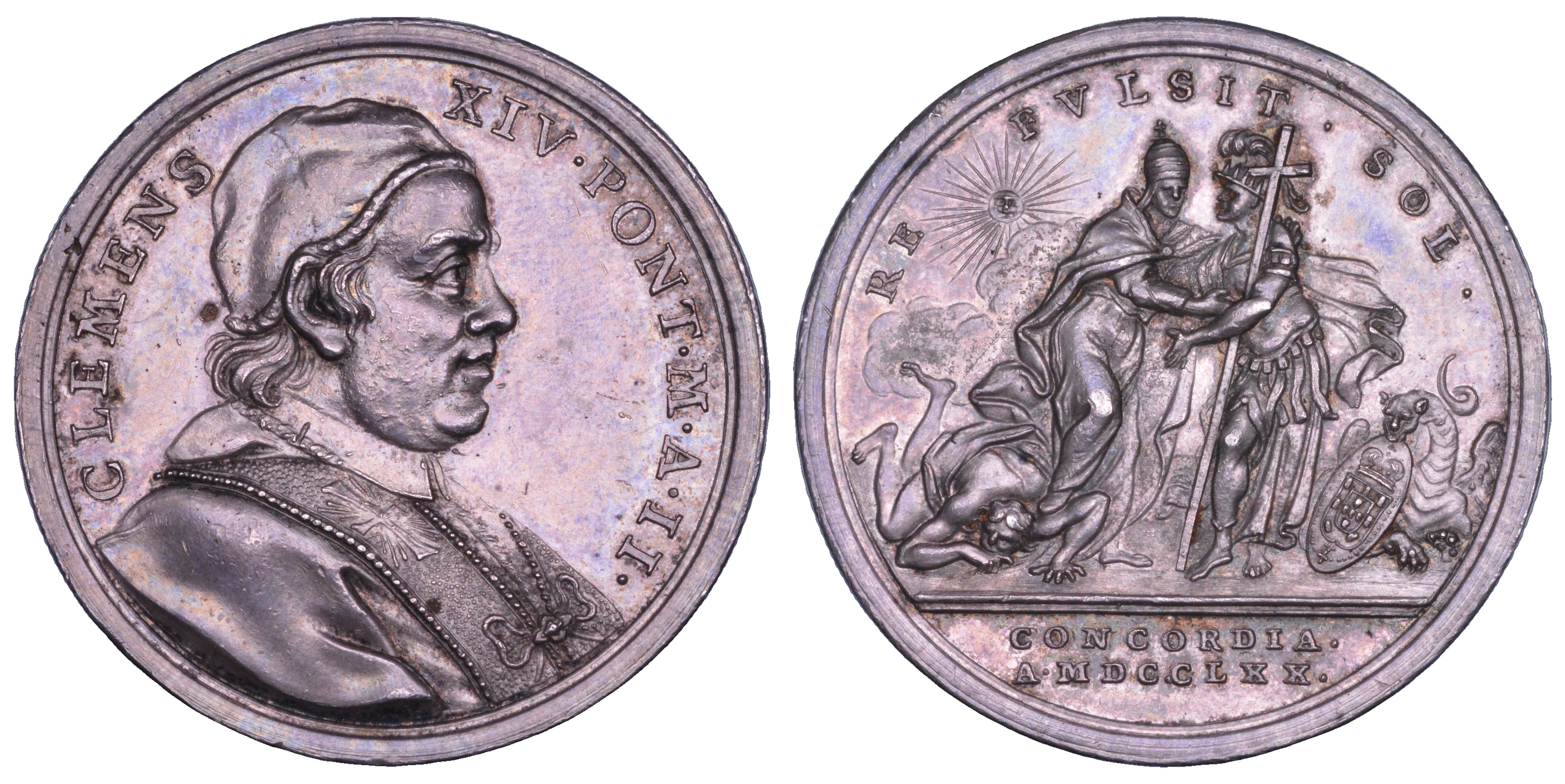 CLEMENS XIV PONT M A II Busto a d. con camauro, mozzetta e stola. R/ RE FVLSIT SOL in esergo CONCORDIA A MDCCLXX Figura allegorica della Chiesa che abbraccia un guerriero con la croce, mentre con un piede calpesta una figura a terra; a destra un drago. Opus Ferdinando Hamerani. Modesti 248. Bart. E 770. g. 15,27. Diam. mm. 32,92. Arg. q.SPL