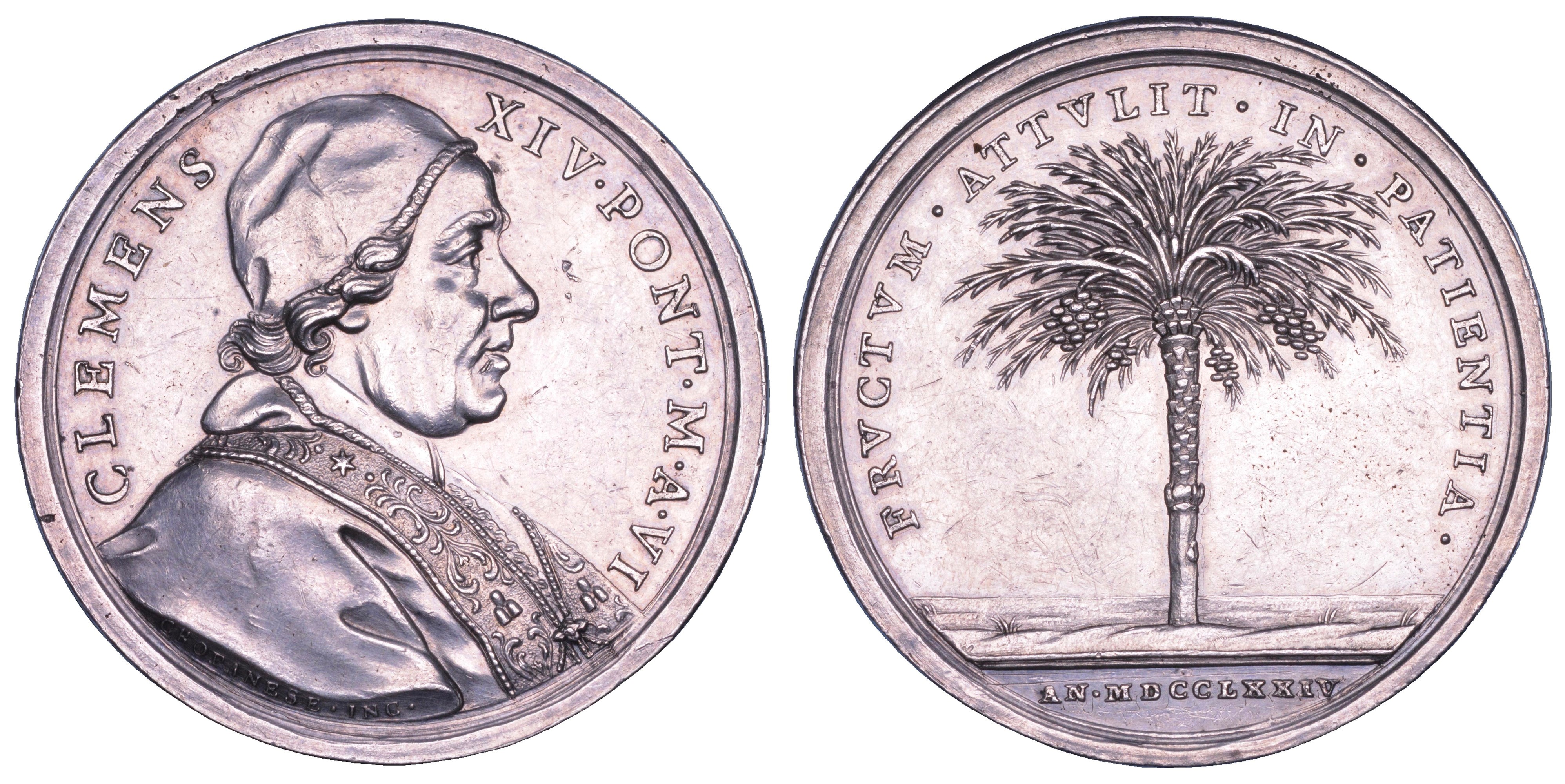 CLEMENS XIV PONT M A VI Busto a d. con camauro, mozzetta e stola ornata. R/ FRVCTVM ATTVLIT IN PATIENTIA Albero di palma, emblema di vittoria e di pace ottenuta in esergo, AN MDCCLXXIV. Opus Filippo Cropanese. Bart. E774. Modesti 252. Rara. g. 24,67. Diam. mm. 39,67. Arg. Graffi. BB/SPL