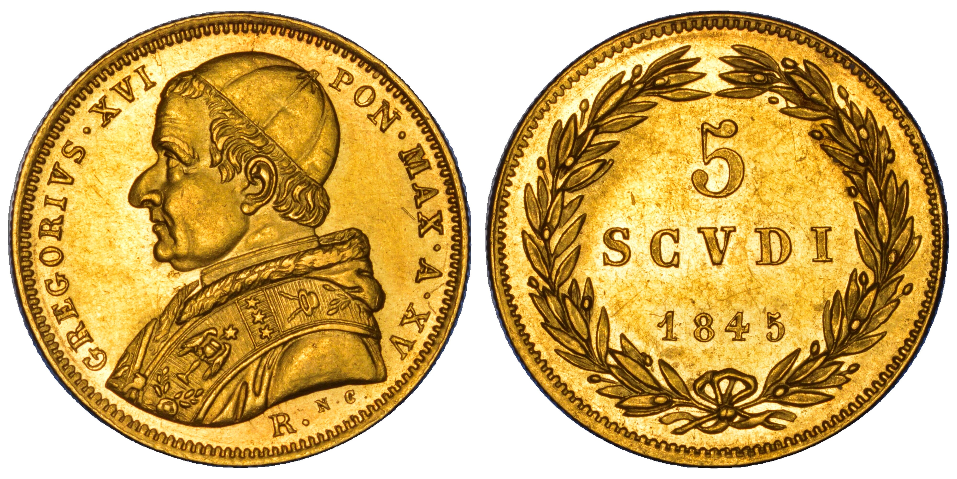 STATO PONTIFICIO. GREGORIO XVI, 1831-1846. 5 Scudi 1845/A. XV. Roma.