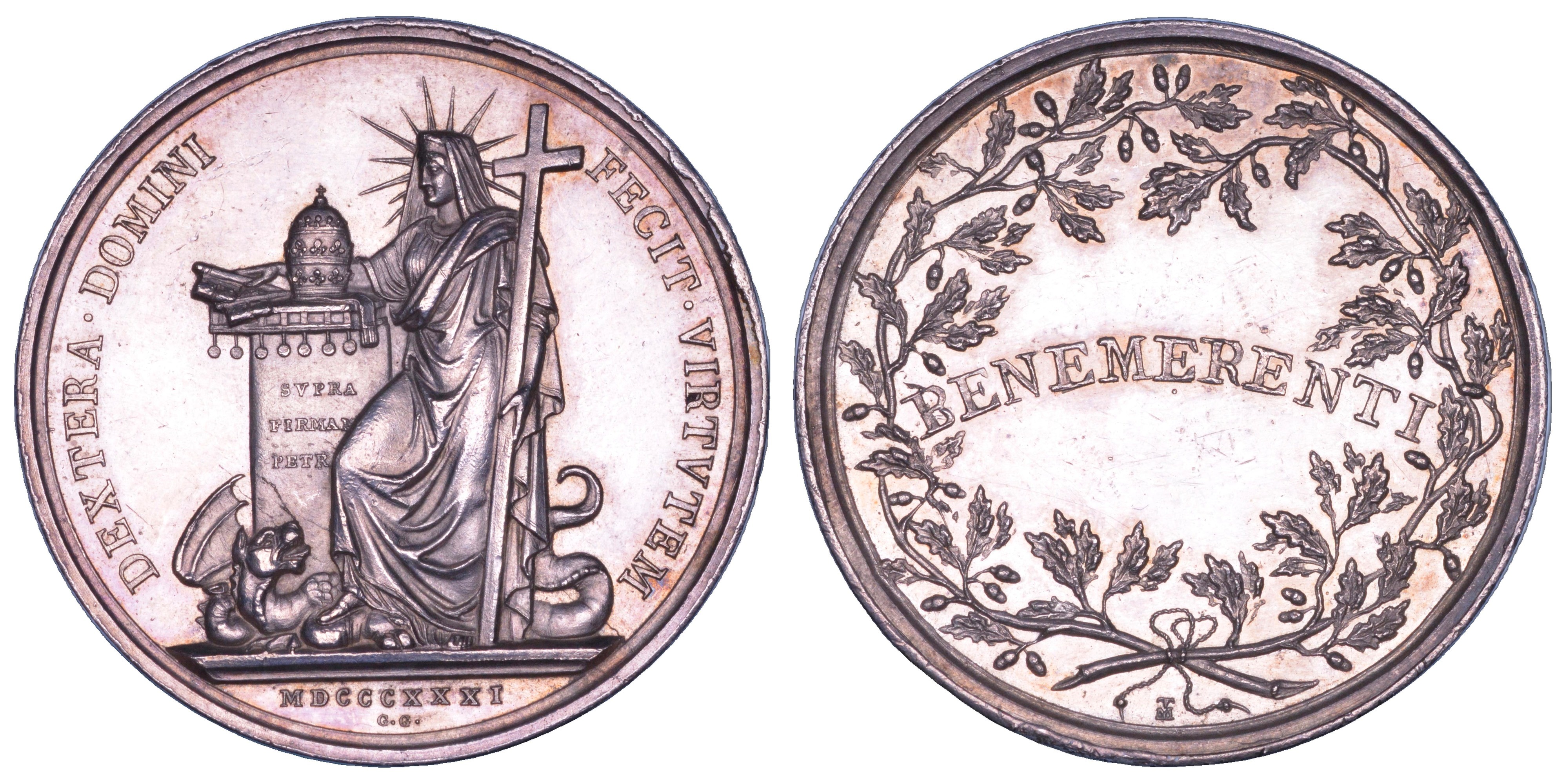 DEXTERA DOMINI FECIT VIRTVTEM La Religione appoggiata ad una colonna con croce, chiavi e triregno calpesta l'idra sulla colonna: SVPRA FIRMAM PETR in esergo MDCCCXXXI G G. R/ BENEMERENTI all'interno di corona di quercia. Opus Giuseppe Girometti (diritto). Tommaso Mercandetti (rovescio). Medaglia inedita ibrida. Diritto tipo Bart. E831. Boccia 2. Modesti 299. Tipo per il rovescio Boccia 59. Rarissima. g. 32,73. Diam. mm. 43,16. Arg. Irregolarità di conio. SPL/FDC