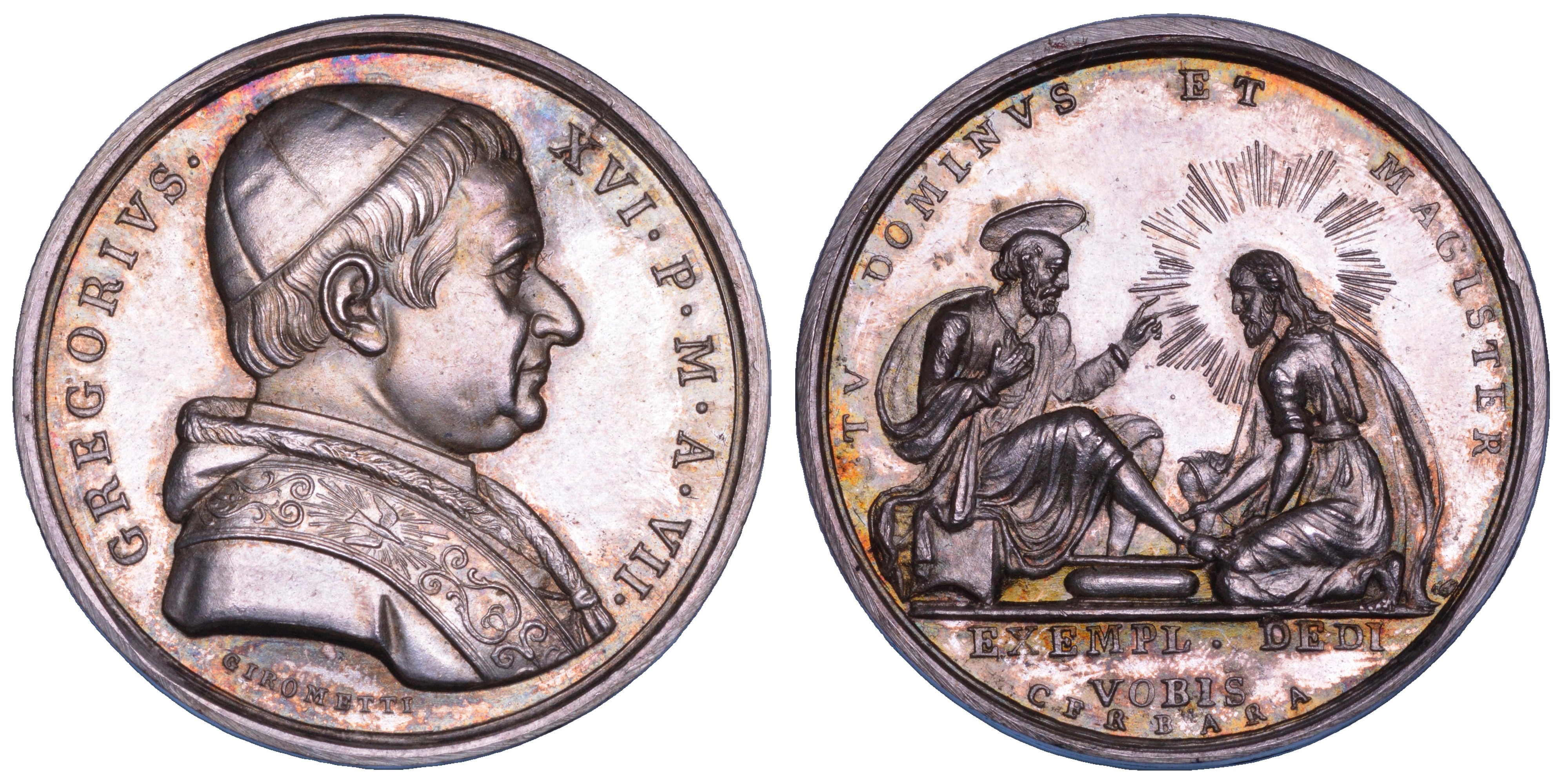 GREGORIVS XVI P M A VII Busto del Pontefice a d. con zucchetto, mozzetta e stola. R/ TV DOMINVS ET MAGISTER Gesù radiato lava i piedi a S. Pietro in esergo, EXEMPL DEDI VOBIS. Opus Giuseppe Girometti (diritto) e Giuseppe Cerbara (rovescio). Boccia, 86. Molto rara. g. 15,15. Diam. mm. 32,65. Arg. q.FDC