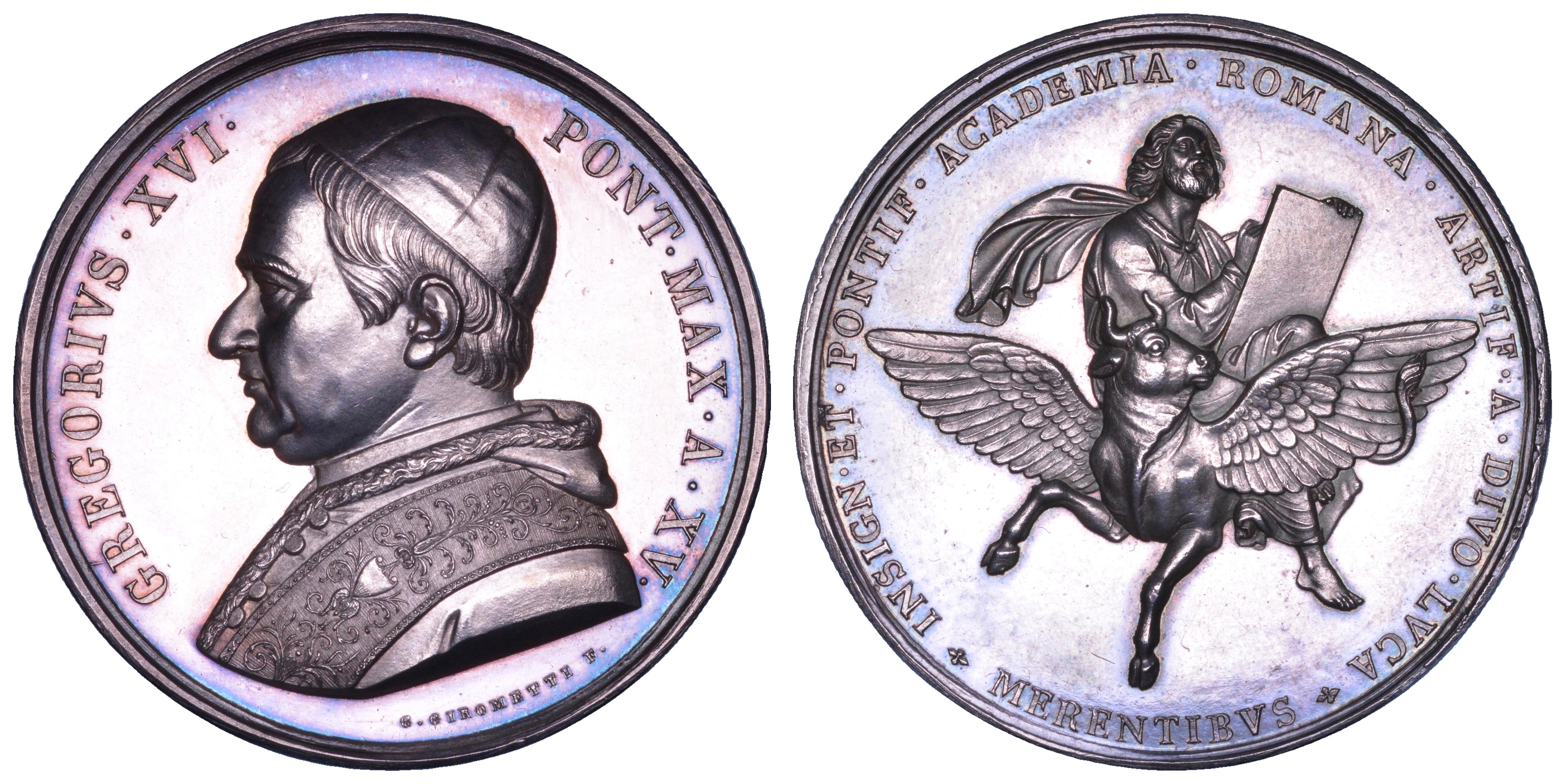 GREGORIVS XVI PONT MAX ANNO XV Busto a s. con zucchetto e stola. R/ INSIGN ET PONTIF ACADEMIA ROMANA ARTIF A DIVO LVCA, San Luca, su di un toro alato, intento a dipingere sotto, MERENTIBVS. Inedita per l'anno XV. Estremamente rara. g. 28,15. Diam. mm. 43,80. Arg. Lievi graffi. SPL/FDC