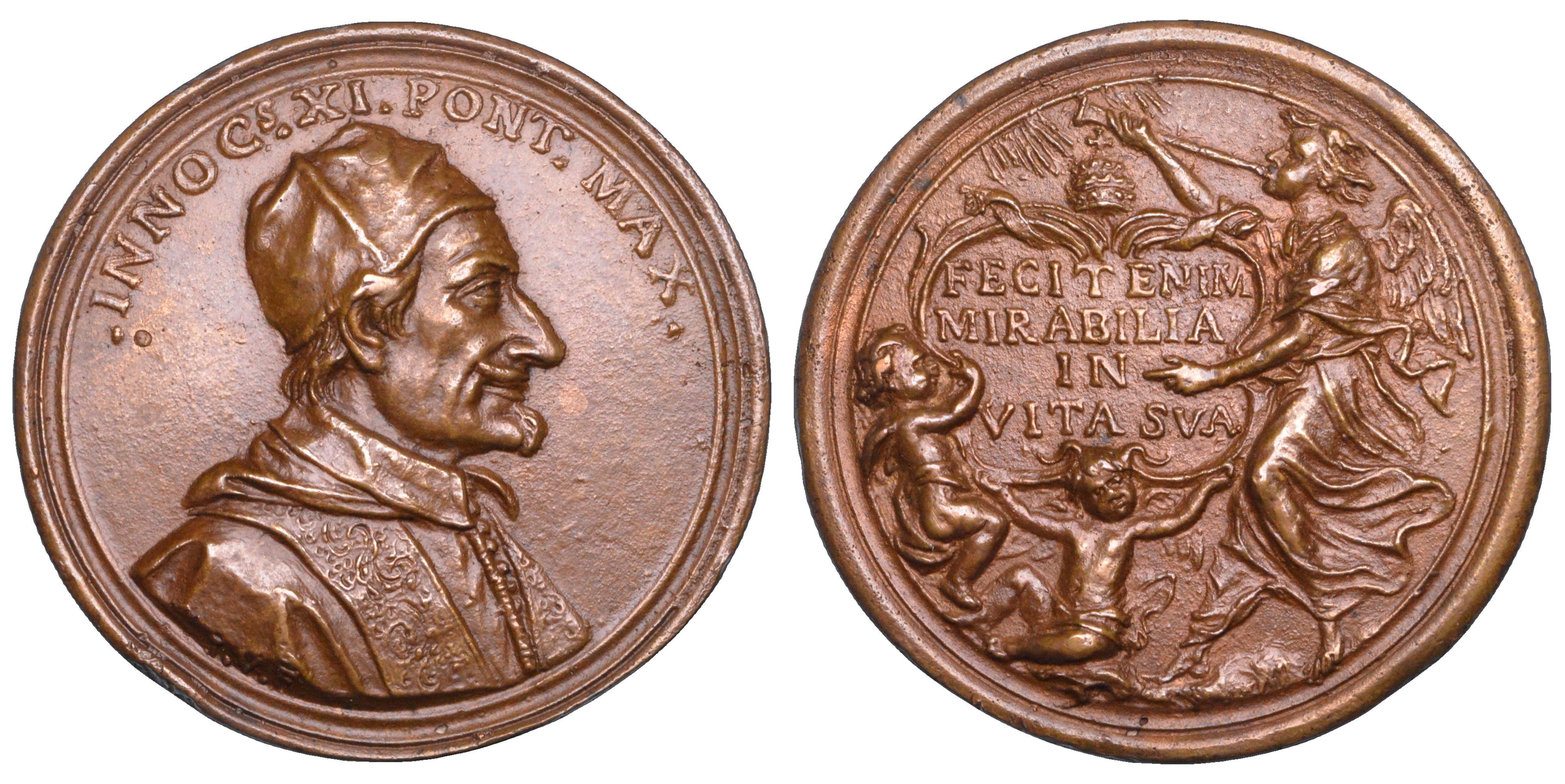 INNOCs XI PONT MAX Busto del Pontefice a d. con camauro, mozzetta e stola ornata. R/ La Fama annuncia con tromba e indica, sorretta da putti, una cartella su cui FECIT ENIM MIRABILIA IN VITA SVA. Opus Giuseppe Vismara. Miselli p. 228, 242. Alteri 55. g. 71,53. Diam. mm. 69,41. Bronzo. q.SPL