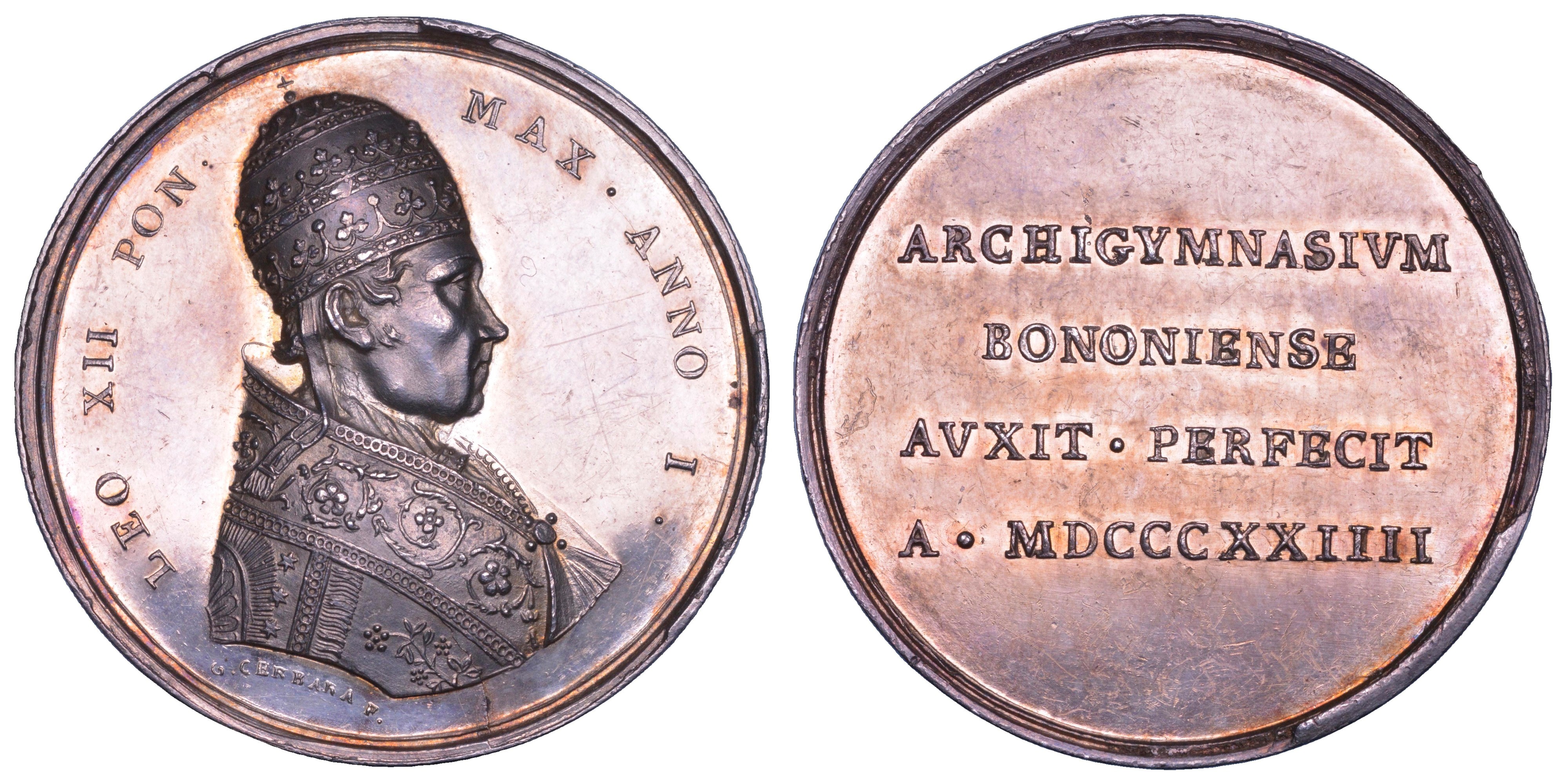 LEO XII PON MAX ANNO I. Busto a d. con triregno e piviale. R/ ARCHIGYMNASIVM BONONIENSE AVXIT PERFECIT A MDCCCXXIIII. Iscrizione disposta su quattro righe. Opus Giuseppe Cerbara. Bertuzzi 15. Patrignani 15. Rara. g. 29,46. Diam. mm. 42,49. Arg. Irregolarità di conio. SPL/FDC