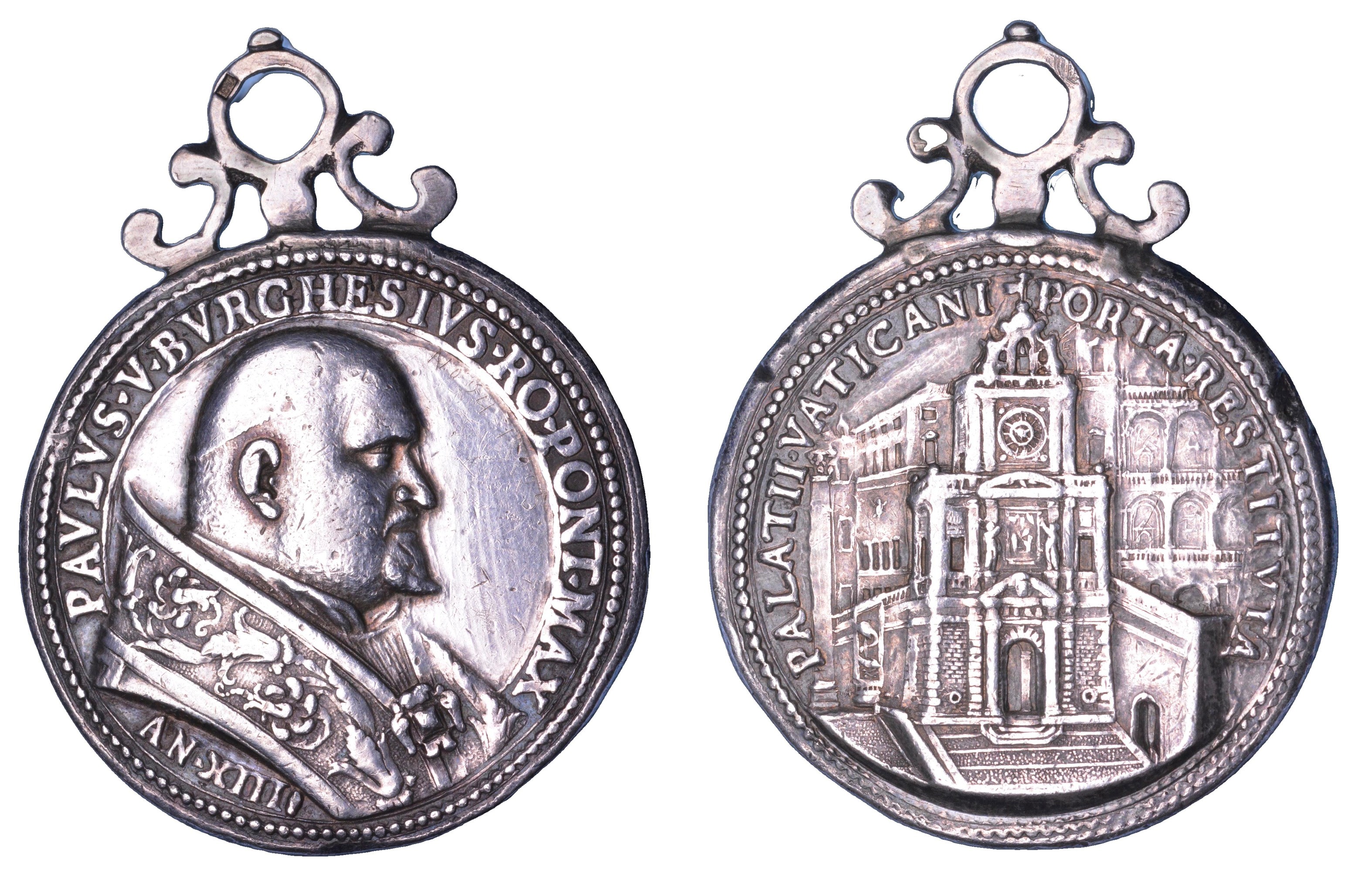STATO PONTIFICIO. PAOLO V (Camillo Borghese), 1605-1621. Medaglia in argento (1618)/A. XIIII. Ricostruzione della Porta Vaticana.