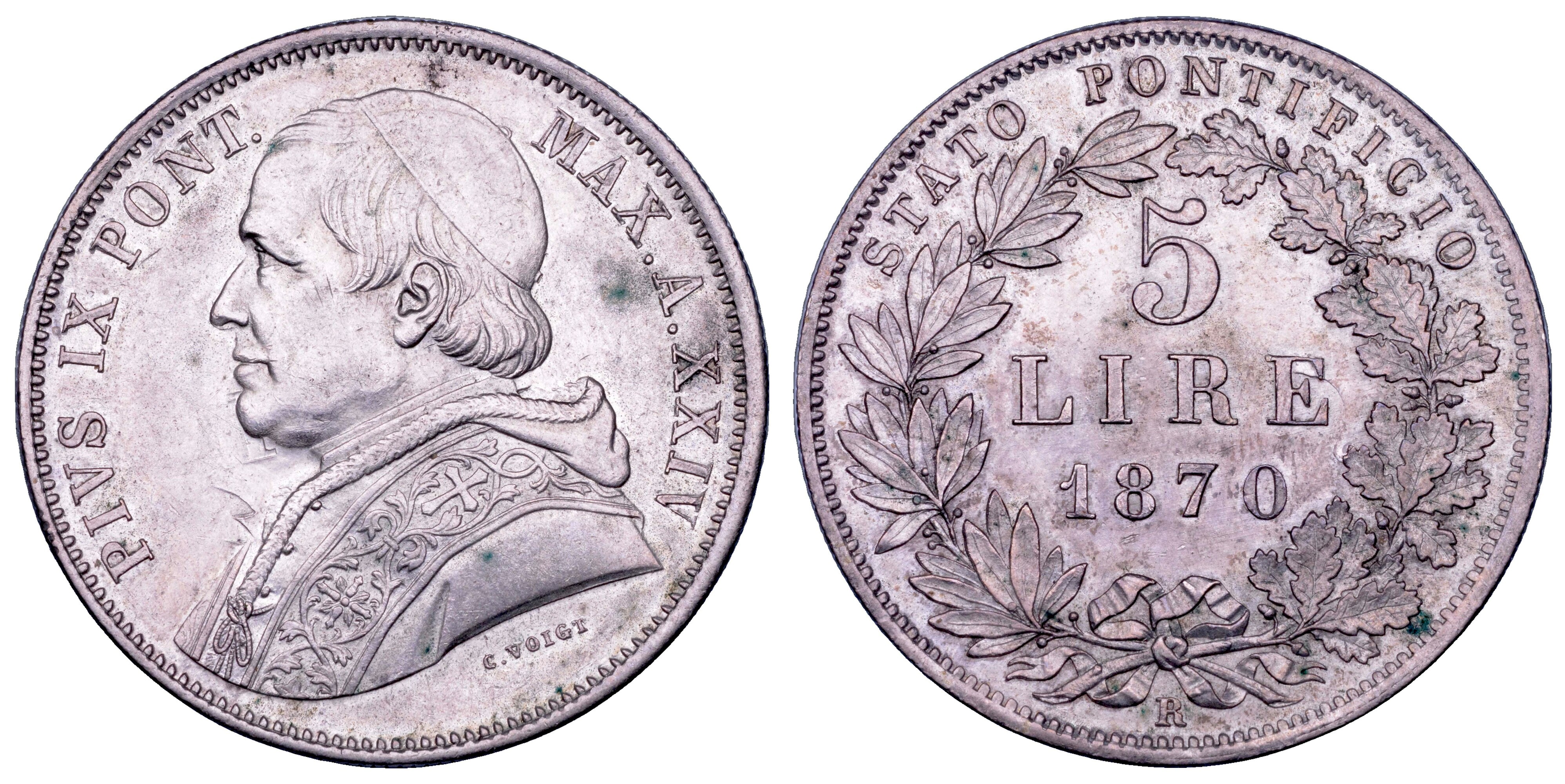 STATO PONTIFICIO. PIO IX, 1846-1878. 5 Lire 1870/A. XXIV. Roma.