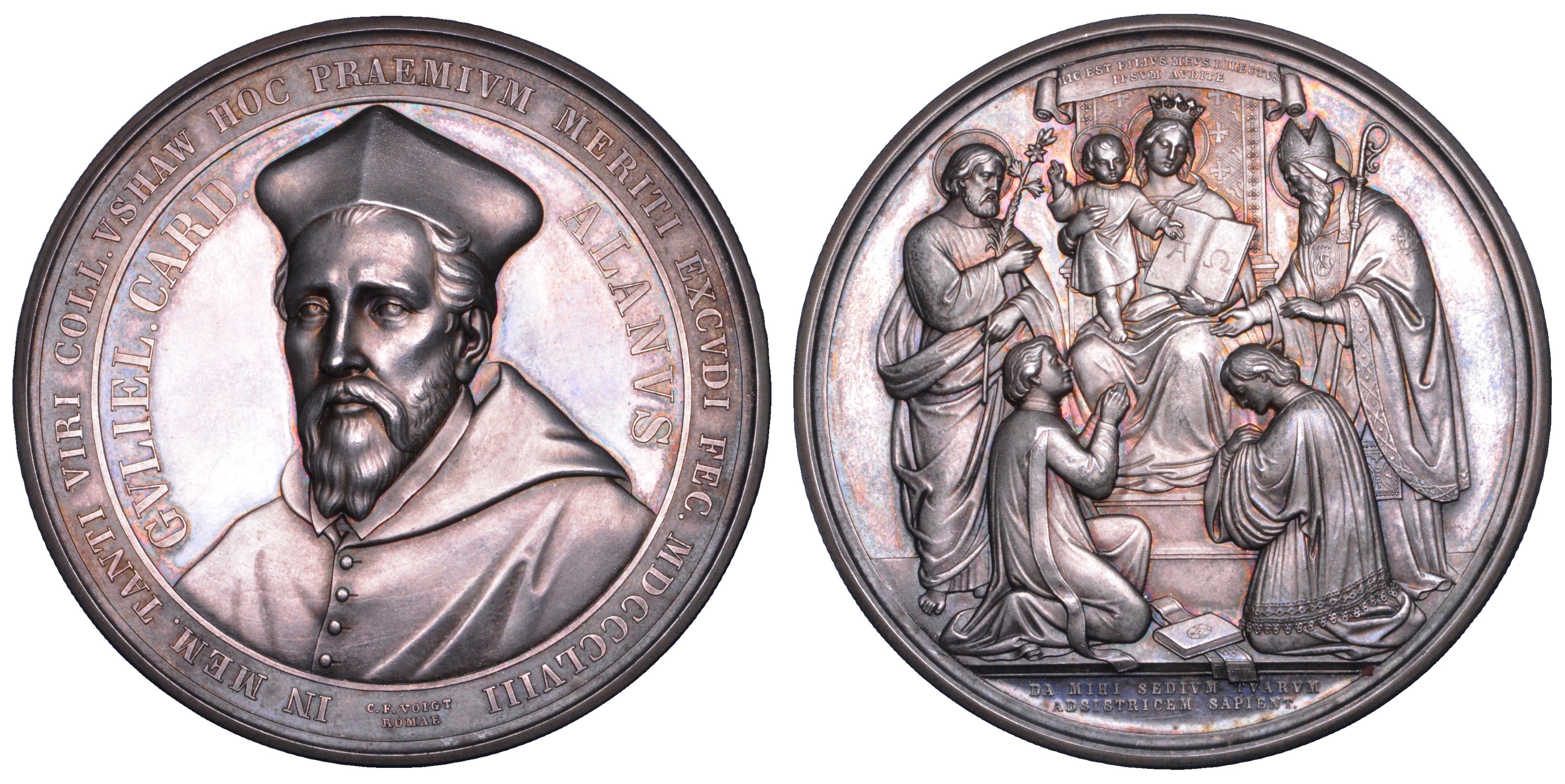 GVLIEL CARD ALANVS IN MEM TANTI VIRI COLL VSHAW HOC PRAEMIVM MERITI EXCVDI FEC MDCCCLVIII. Busto di tre quarti del cardinale William Allen. R/ Figure assistono in piedi e genuflessse la Madonna col Bambino, HIC EST FILIVS MEVS DILECTVS IPSVM AVDITE sul nastro sopra, e in esergo DA MIHI SEDIVM TVARVM AD SISTRICEM SAPIENT. Opus C. F. Voigt. Inedita. Rarissima. g. 151,88. Diam. mm. 66,55. Arg. q.FDC