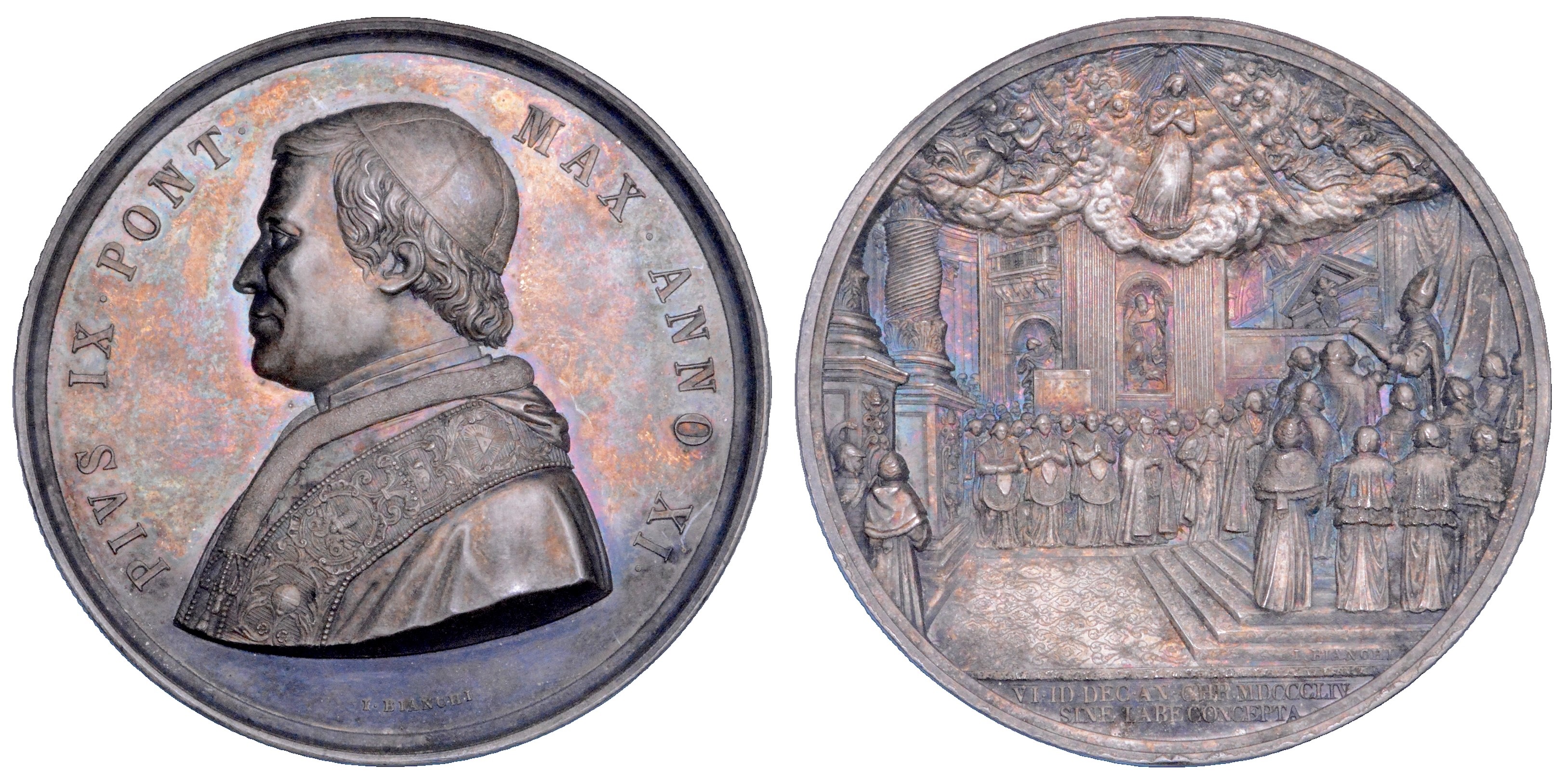 PIVS IX PONT MAX ANNO XI Busto a s. con zucchetto, mozzetta e stola ornata. R/ Il Pontefice, davanti all'altare maggiore di S. Pietro e tra una schiera di cardinali e vescovi, legge la promulgazione del dogma; in alto, la Beata Vergine irradiata dalla colomba dello Spirito Santo e, ai lati, quattro angeli. All'esergo, VI ID DEC AN CHR MDCCCLIV SINE LABE CONCEPTA. Opus Ignazio Bianchi. Modesti 323. Bartolotti E856. g. 36,50. Diam. mm. 43,41. Arg. q.FDC