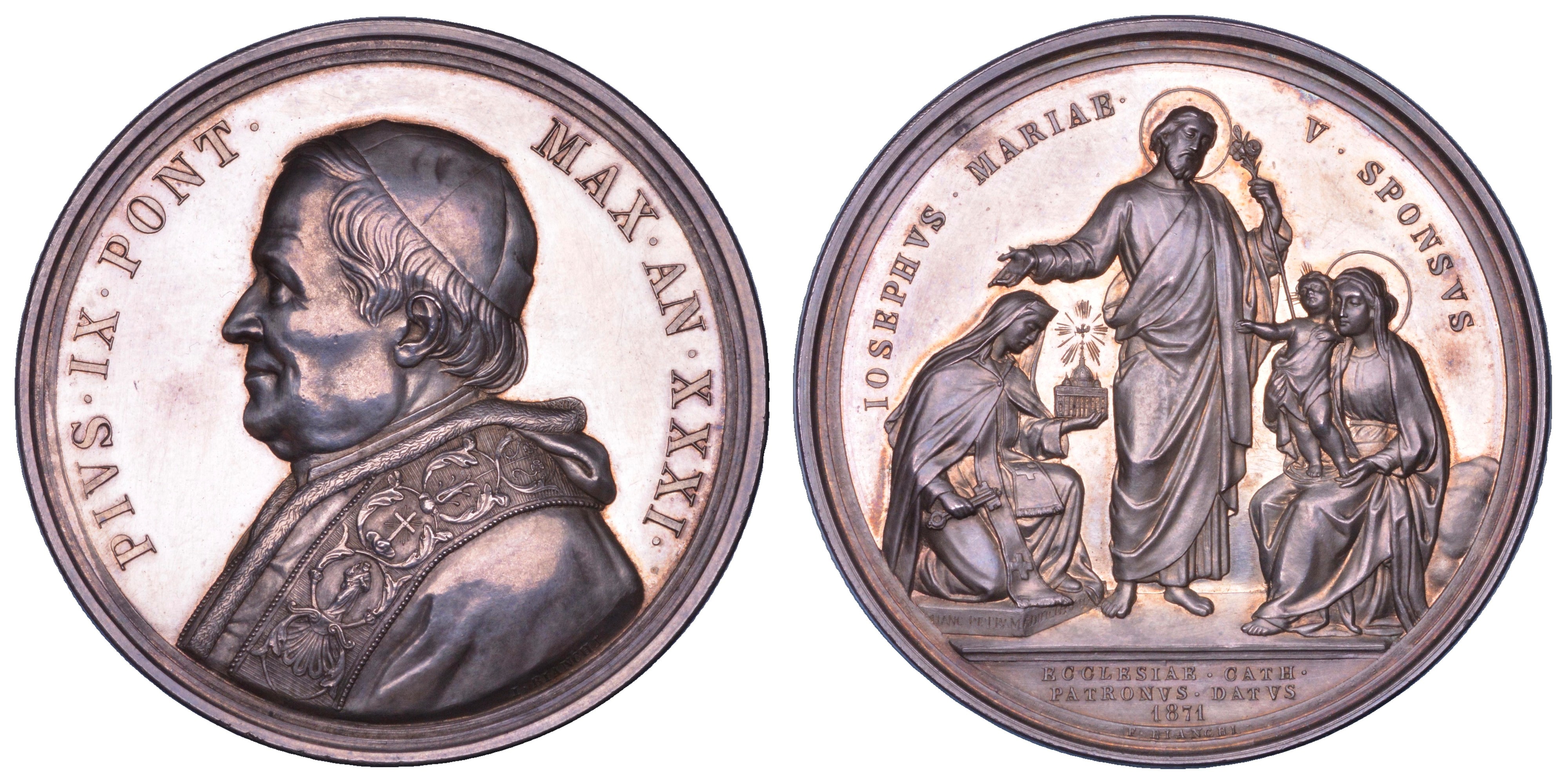 PIVS IX PONT MAX AN XXXI Busto a s. con berretto, mozzetta e stola. R/ IOSEPHVS MARIAE V SPONSVS San Giuseppe in piedi con giglio, tra la Madonna col Bambino e la Religione; in esergo, ECCLESIAE CATH PATRONVS DATVS 1871. Opus Giuseppe Bianchi. Modesti, 343. Bart. E876. g. 34,91. Diam. mm. 43,88. Arg. Lievissimi graffi da pulizia. q.FDC.