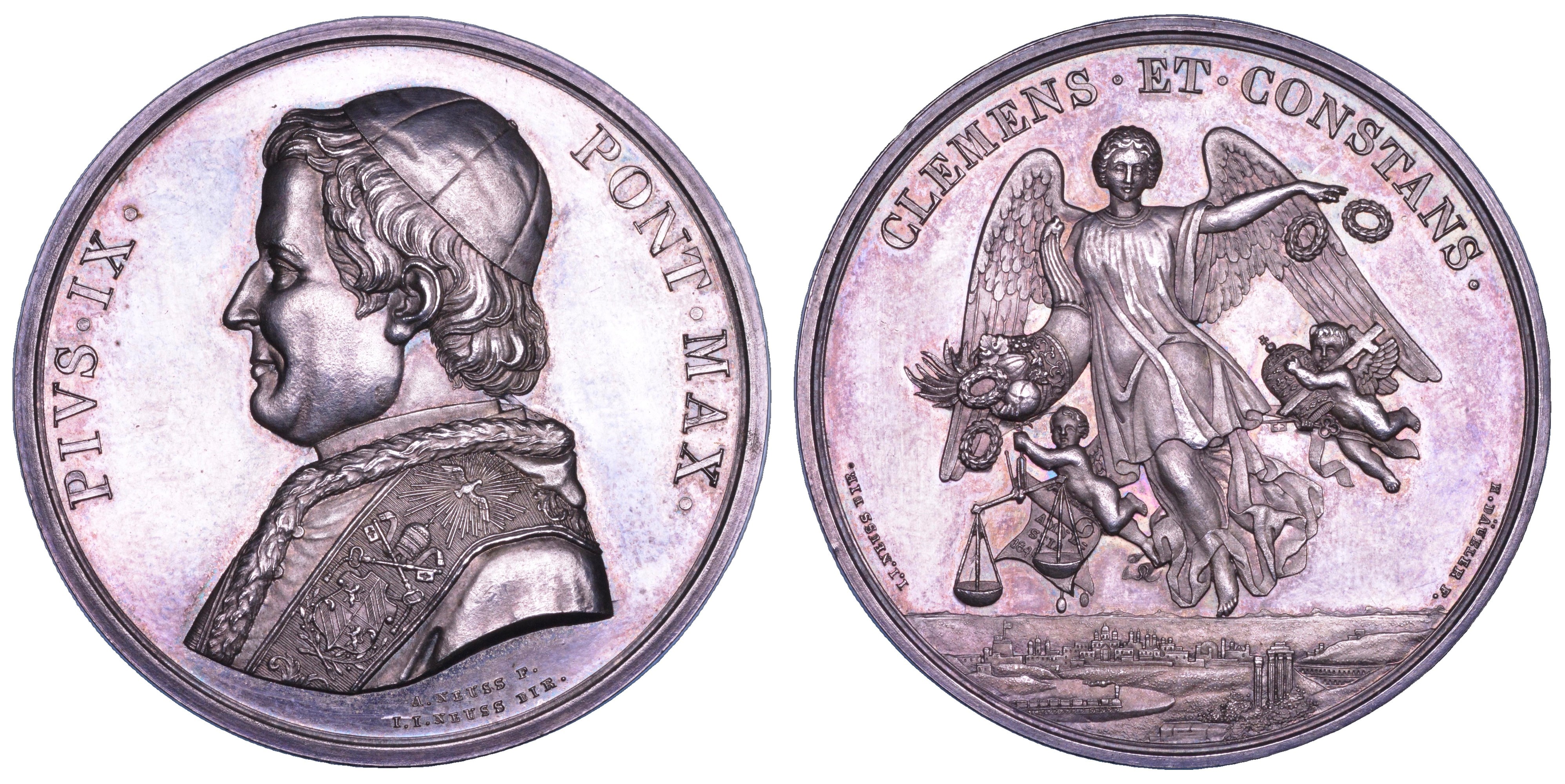 PIVS IX PONT MAX Busto a s. con berretto, mozzetta e stola. R/ CLEMENS ET CONSTANS. Angelo in volo che sparge da una cornucopia corone di fiori. Ai suoi lati due angioletti, quello di d. porta triregno, chiavi e croce, quello di s. una bilancia e una pergamena semiarrotolata sulla quale si legge AMNI STIA 1846. Sotto: paesaggio con ferrovia, treno ed edifici monumentali. Opus A. Neuss, L Neuss, H. Daübler. Bart. Pio IX I-30. Rara. g. 20,69. Diam. mm. 40,81. Arg. q.FDC