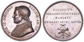 PIVS IX PONTIFEX MAXIMVS AN III Busto a s. con berretto, mozzetta e stola. R/ COLLEGIVM NEGOTIATORVM VRBIS HONORIS ET GRATI CAVSA in quattro righe sopra simbolo formato da falce, ancora, fasci, caduceo. Opus Giuseppe Cerbara. Inedita. Estremamente rara. g. 32,97. Diam. mm. 43,74. Arg. SPL