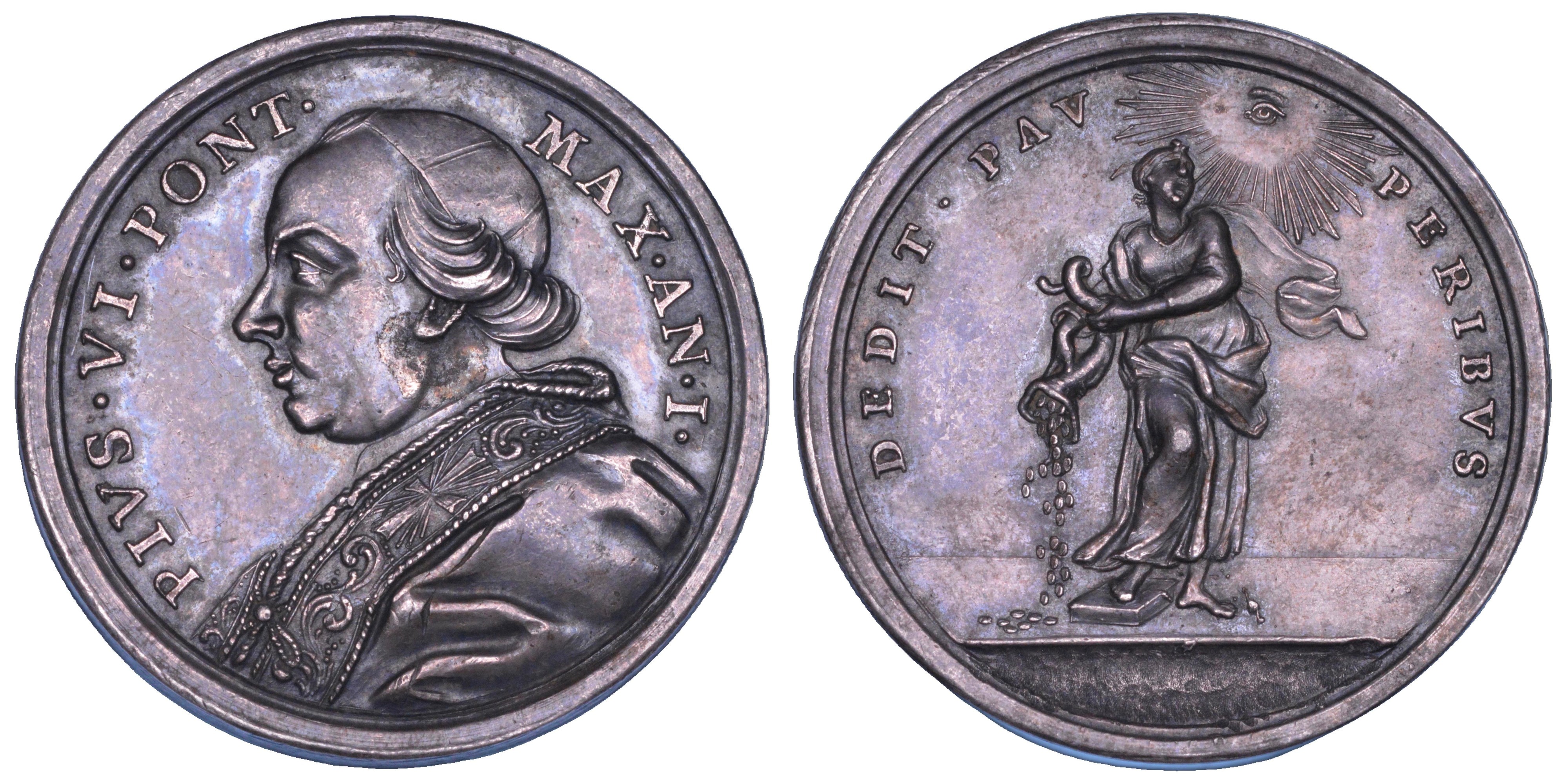 PIVS VI PONT MAX AN I Busto del Pontefice a s. con zucchetto, mozzetta e stola ornata. R/ DEDIT PAVPERIBVS Figura femminile in piedi versa monete da una cornucopia.. Patrignani agg. 2 bis. Rarissima. g. 12,98. Diam. mm. 30,75. Arg. SPL