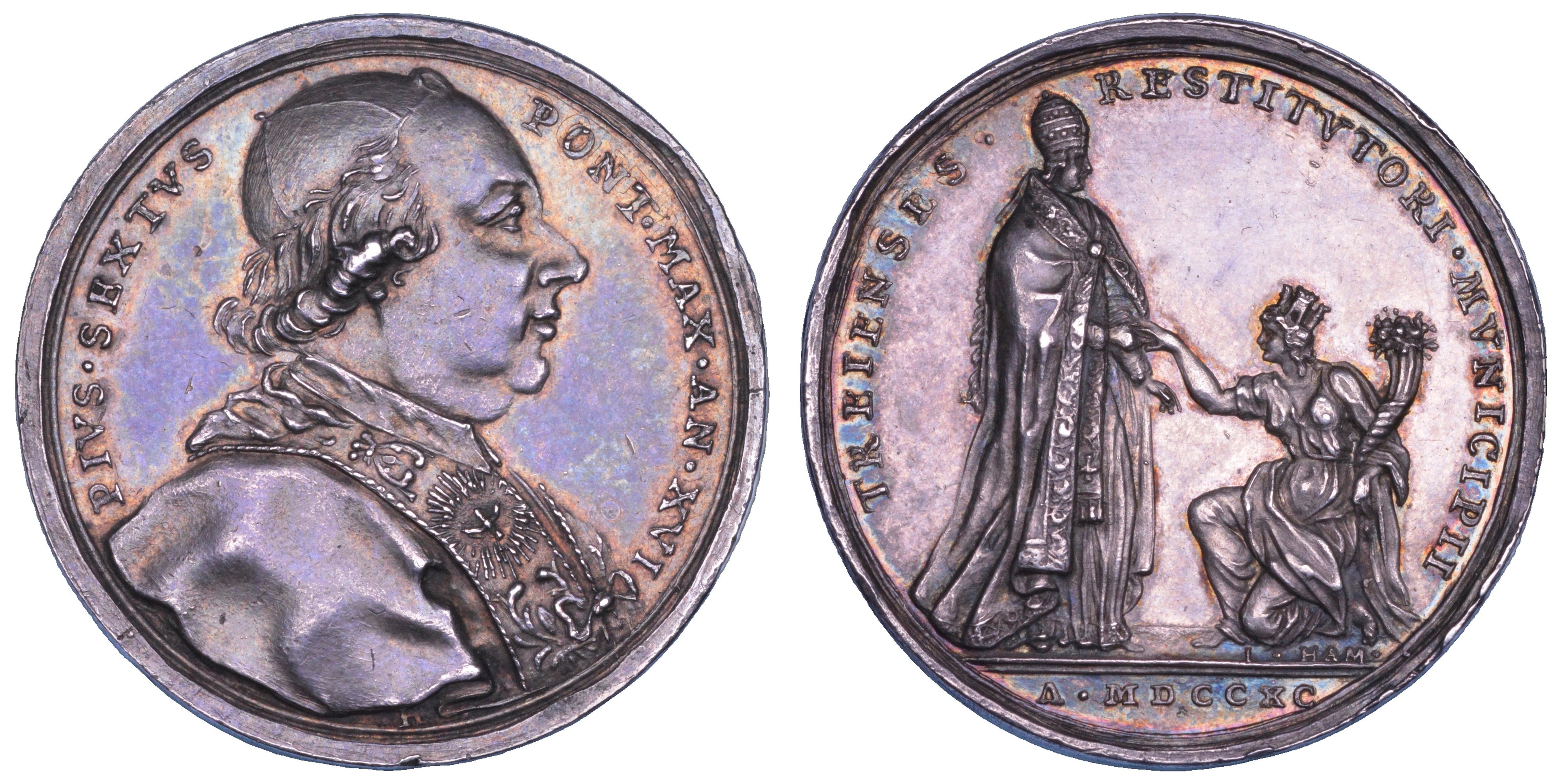 PIVS VI PONT MAX AN XVI Busto del Pontefice a d. con zucchetto, mozzetta e stola ornata. R/ TREIENSES RESTITVTORI MVNICIPII Il Pontefice, in paludamento solenne, in piedi e rivolto a d., dà la mano alla turrita città di Treja nel Piceno, con lunga cornucopia e inginocchiata davanti a lui. Patrignani 71. Rarissima. g. 13,60. Diam. mm. 31,40. Arg. Irregolarità di conio sul bordo. q.SPL