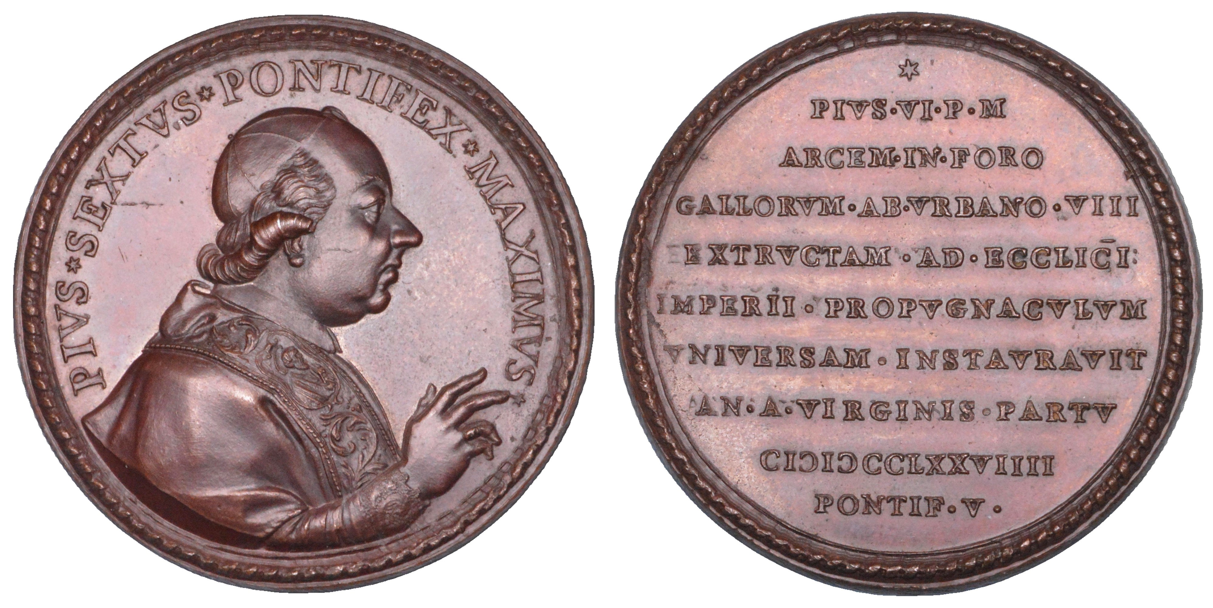 Nel giro, PIVS SEXTVS PONTIFEX MAXIMVS Busto del Pontefice a d. con camauro, mozzetta e stola ornata, nell'atto di benedire. R/ PIVS VI P M ARCEM IN FORO GALLORVM AB VRBANO VIII EXTRVCTAM AD ECCLICI IMPERII PROPVGNACVLVM VNIVERSAM INSTAVRAVIT AN A VIRGINIS PARTV (data in caratteri romani) PONTIF V scritto nel campo su nove righe. Patrignani, p. 146, 29. g. 54,68. Diam. mm. 51,79. Bronzo. SPL