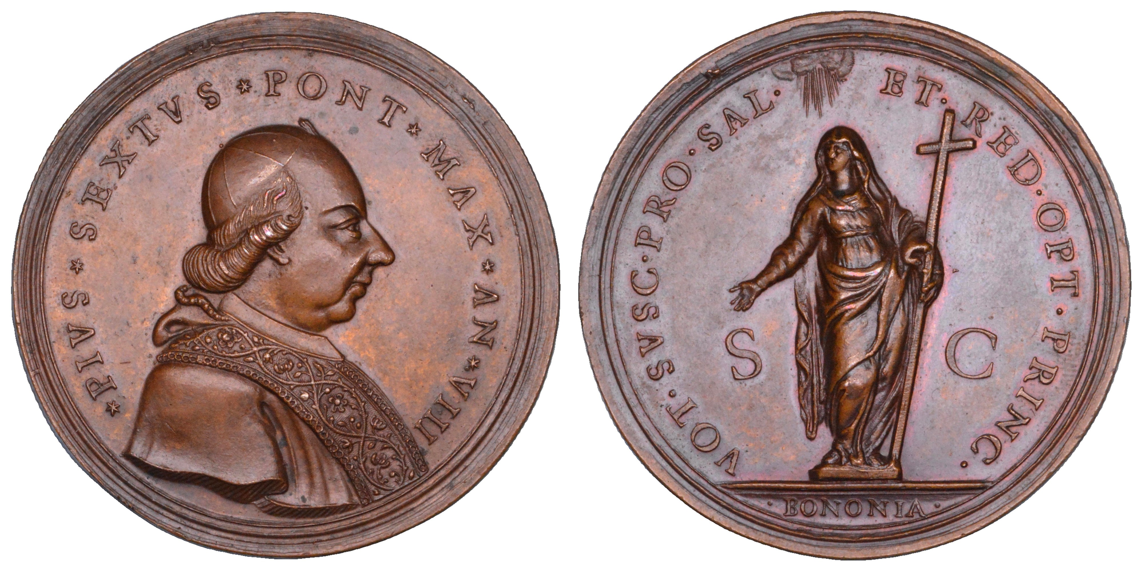 PIVS SEXTVS PONT MAX AN VIII Busto del Pontefice a d. con zucchetto, mozzetta e stola. R/ VOT SVSC PRO SAL ET RED OPT PRINC La Religione stante con lunga croce ai lati S C. In esergo BONONIA. Patrignani 46a. Rara. g. 63,41. Diam. mm. 51,85. Bronzo. SPL