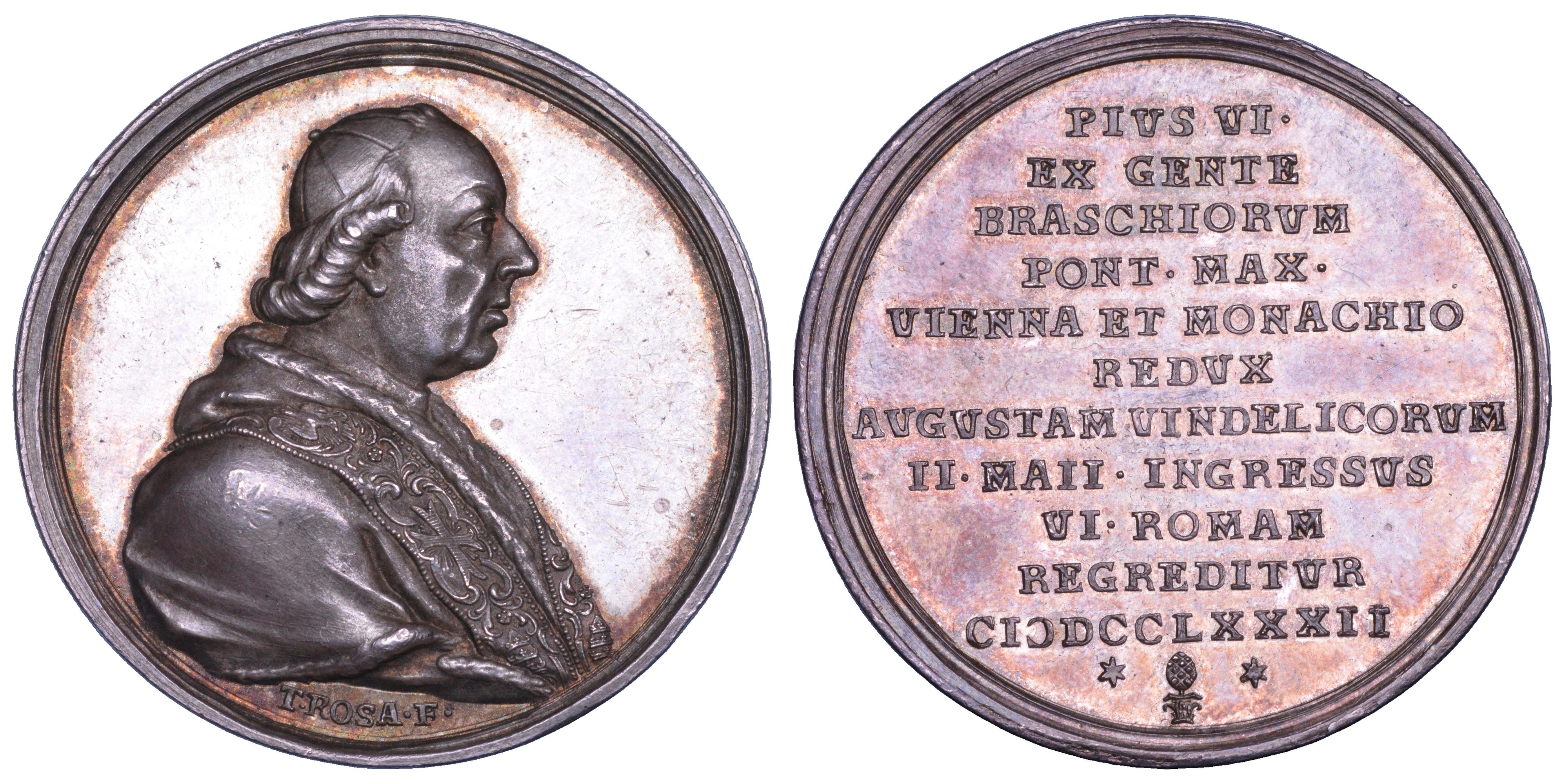 Busto del Pontefice a d. con zucchetto, mozzetta e stola ornata con croce. R/ Scritta su undici righe, PIVS VI EX GENTE BRASCHIORVM PONT MAX VIENNA ET MONACHIO REDVX AVGVSTAM VINDELICORVM II MAII INGRESSVS VI ROMAM REGREDITVR MDCCLXXXII. Opus T. Rosa. Patrignani p. 151, 42b. g. 24,49. Diam. mm. 42,02. Arg. SPL