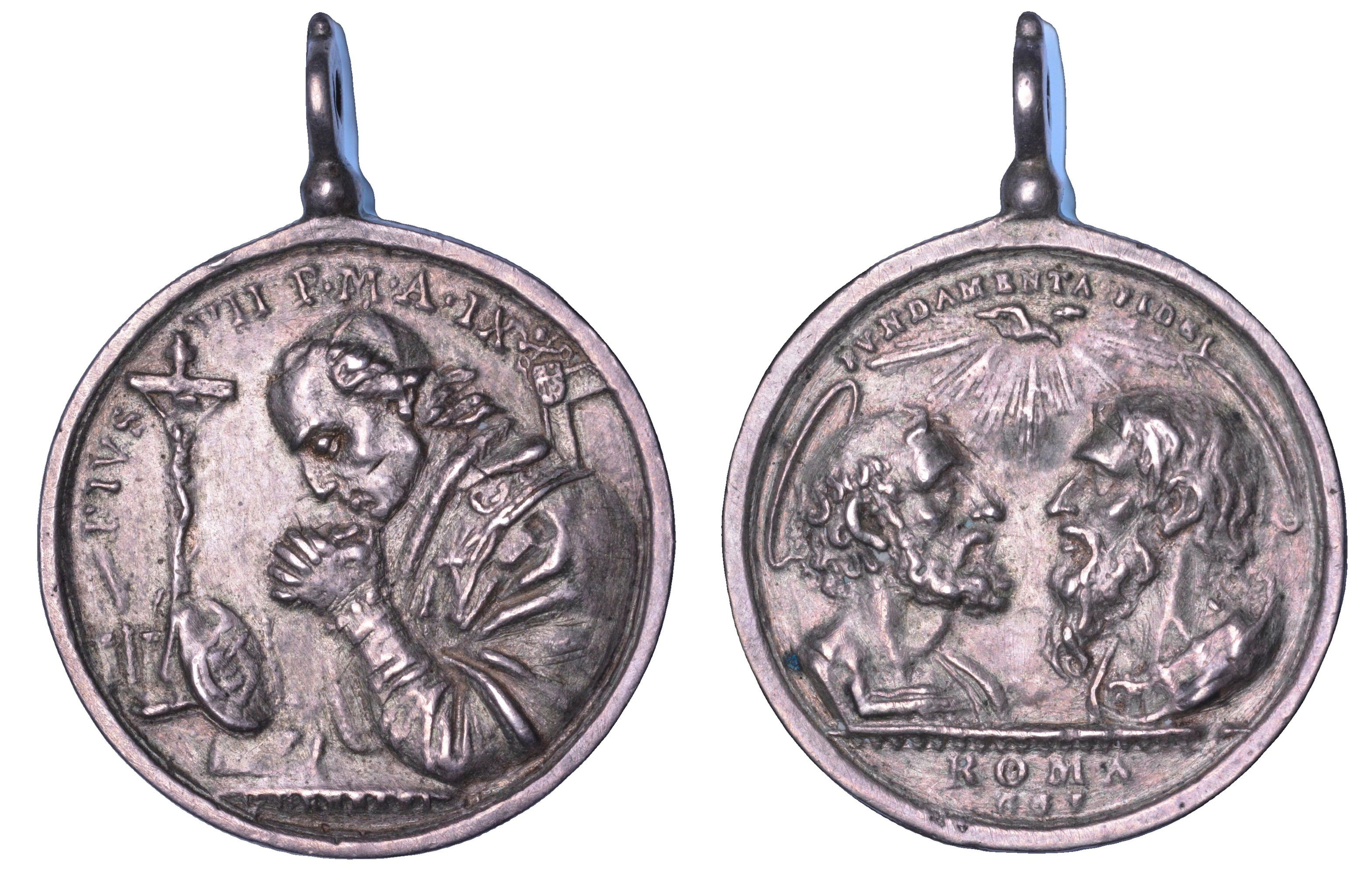 PIVS VII P M A IX Il Papa a d. con zucchetto, mozzetta e stola decorata, mentre sta in orazione davanti al Crocefisso e a un'immagine della Vergine Addolorata. R/ FVNDAMENTA FIDEI Busti affrontati di San Pietro e San Paolo nimbati. Opus Luigi Gennari (diritto) e G. Gennari (rovescio). Miselli, 88. Rarissima g. 25,12. Diam. 47,67 compreso anello. Arg. Fusione. BB