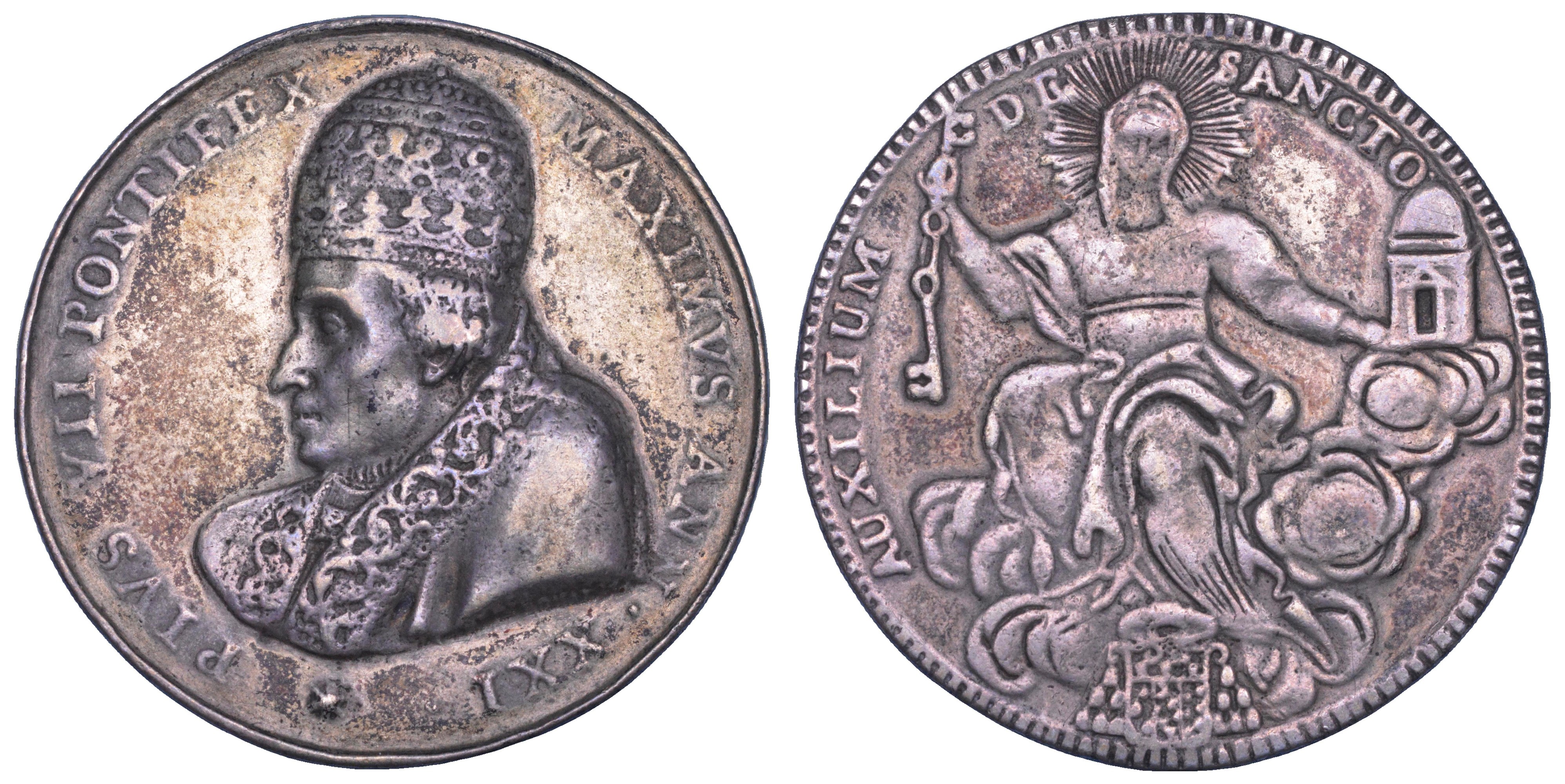 PIVS VII PONTIFEX MAXIMVS ANN XXI Busto di Pio VII rivolto a s. con il triregno, il piviale e la stola decorata con motivi floreali. R/ AUXILIUM DE SANCTO (Figura allegorica femminile rappresentante la Chiesa di fronte, velata e raggiante; seduta sulle nubi tiene nella mano destra due chiavi legate una eretta e l'altra pendente e sostiene nella sinistra distesa, un tempio a cupola su nubi; sotto, l'armetta del Presidente della Zecca; il tutto entro una cornice a trattini verticali). Miselli, 143. Patrignani n. 96 (Pio VII) - Turricchia n. 96. Estremamente rara. g. 14,66. Diam. mm. 39,45. Arg. Lieve doratura. Fusione. MB/BB
