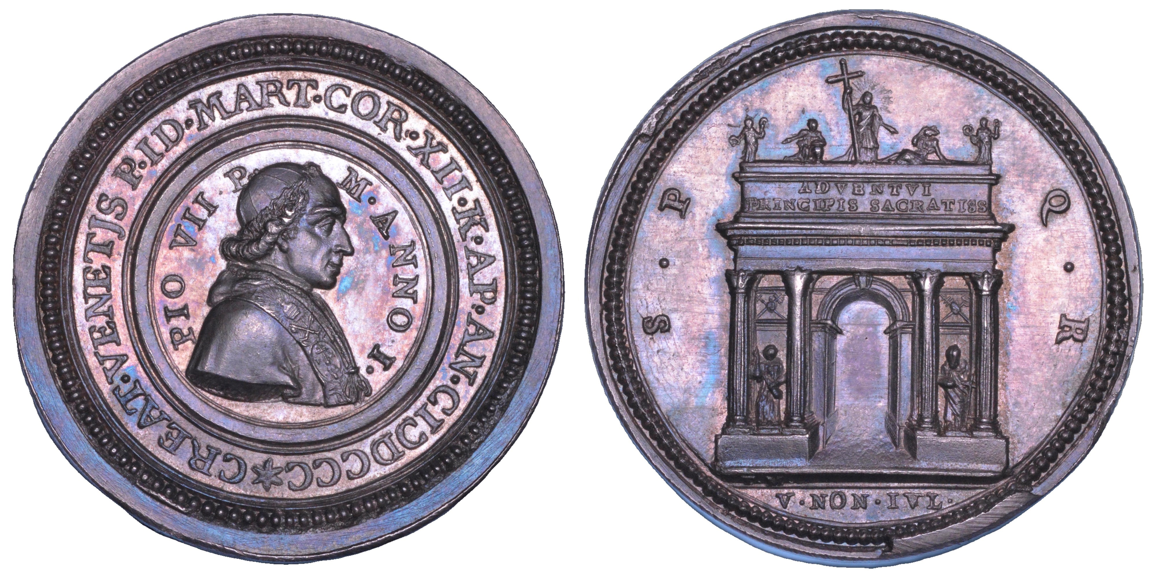 Nel giro esterno, CREAT VENETJS P ID MART COR XII KAP AN CIƆDCCC Nel giro interno, PIO VII P M ANNO I Busto a d. con berretto, mozzetta e stola. R/ S P Q R Arco trionfale costruito a Roma in piazza del Popolo; sull'architrave ADVENTI PRINCIPIS SACRATISS; in esergo, V NON IVL. Opus. T. Mercandetti. Patrignani 5a. Turricchia 226. g. 16,49. Diam. mm. 29,78. Arg. q.FDC