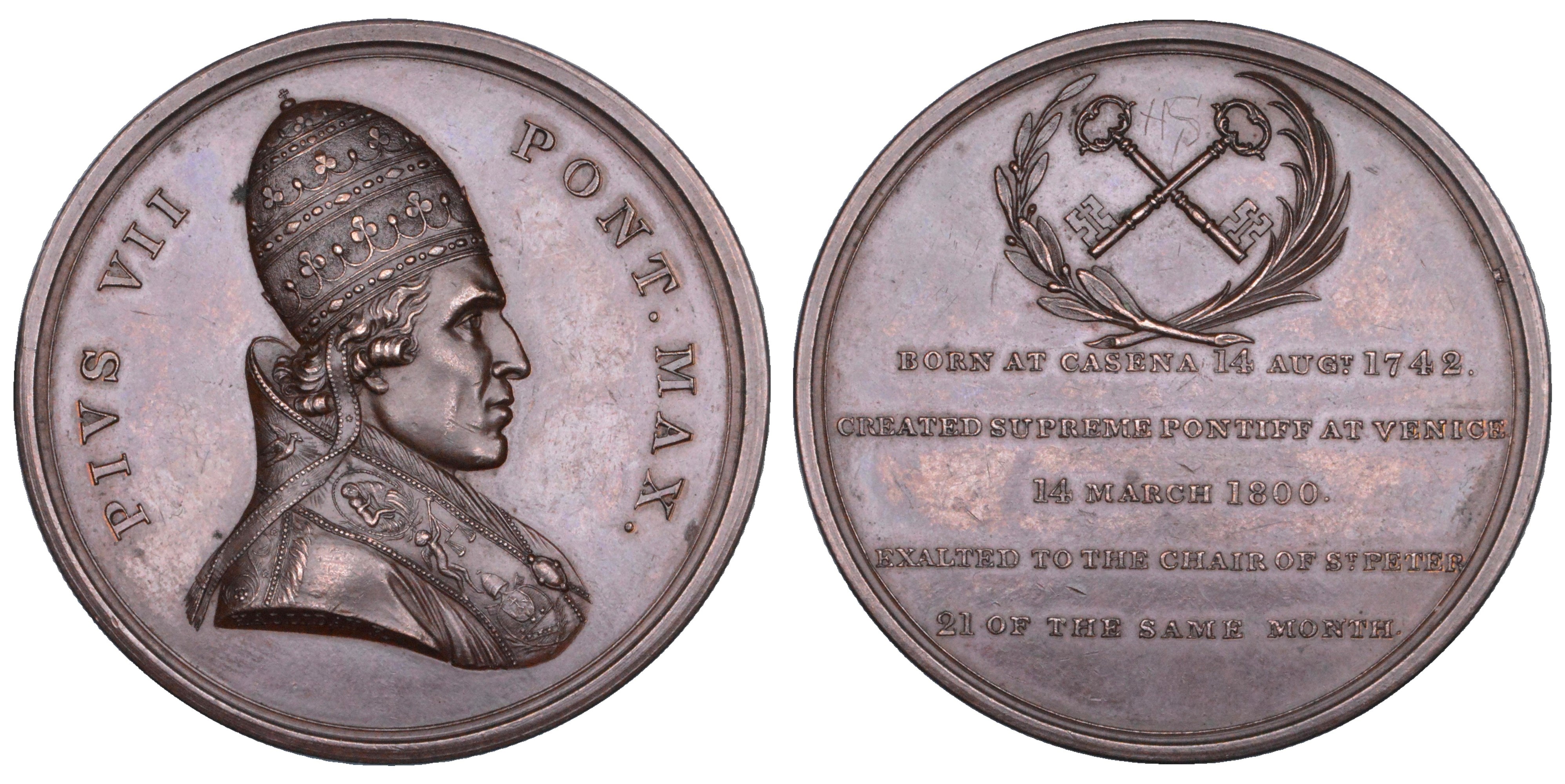 PIVS VII PONT MAX Busto a d. con triregno e piviale ornato. R/ BORN AT CASENA 14 AUGT 1742 CREATED SUPREME PONTIFF AT VENICE 14 MARCH 1800 EXALTED TO THE CHAIR OF St. PETER 21 OF THE SAME MONTH in cinque righe; sopra, due chiavi decussate tra un ramo di palma e di ulivo. Opus T. Halliday. Miselli, 1. g. 63,90. Diam. mm. 54,59. Bronzo. BB/SPL