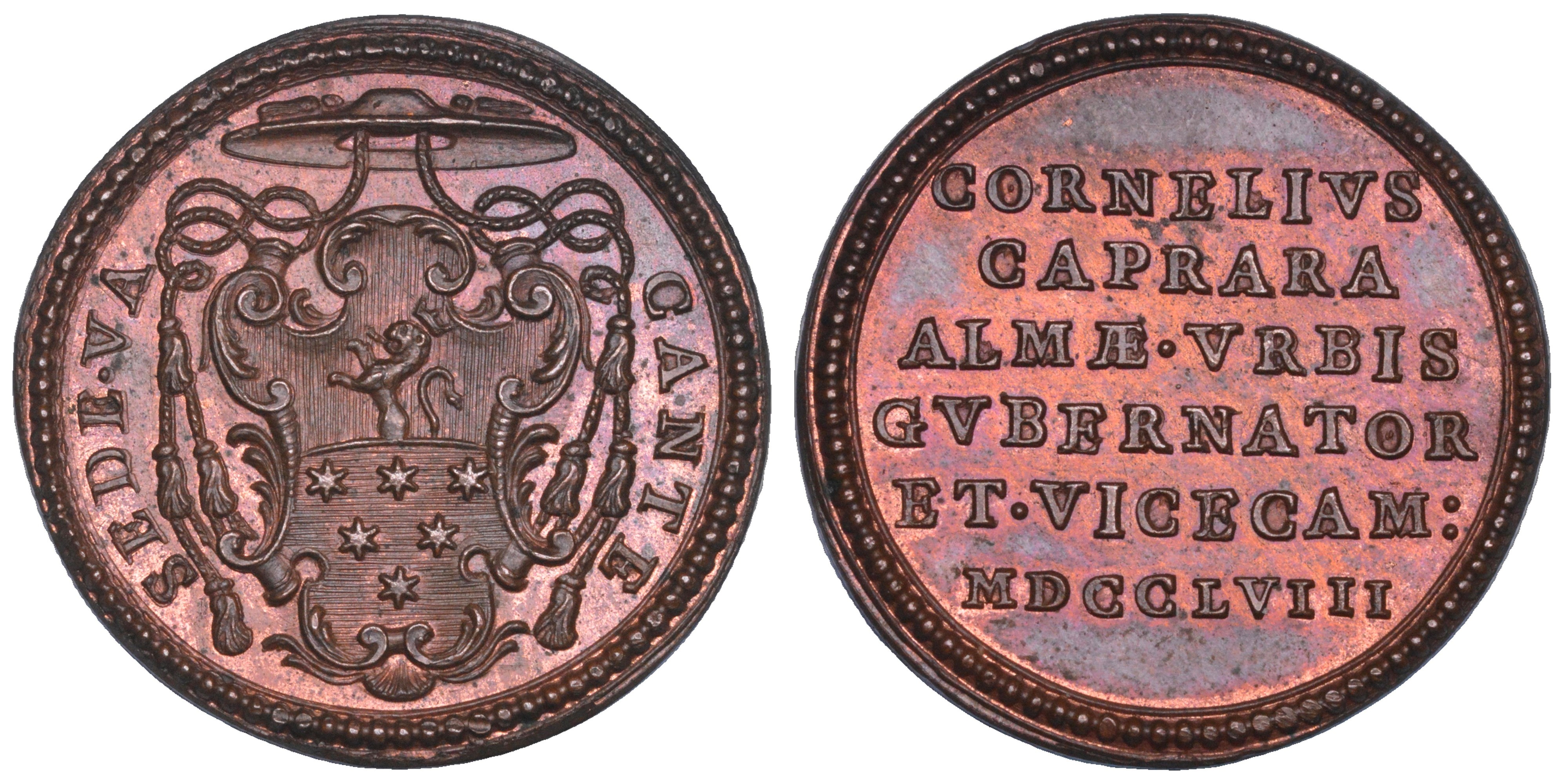 Stemma del Monsignore Cornelio Monti Caprara. R/ CORNELIVS CAPRARA ALMAE VRBIS GVBERNATOR ET VICECAM MDCCLVIII su sei righe. Opus anonimo. Boccia 58. Bartolotti p. 176. Patrignani 82. Molto rara. g. 8,66. Diam. mm. 26,87. Bronzo. q.FDC