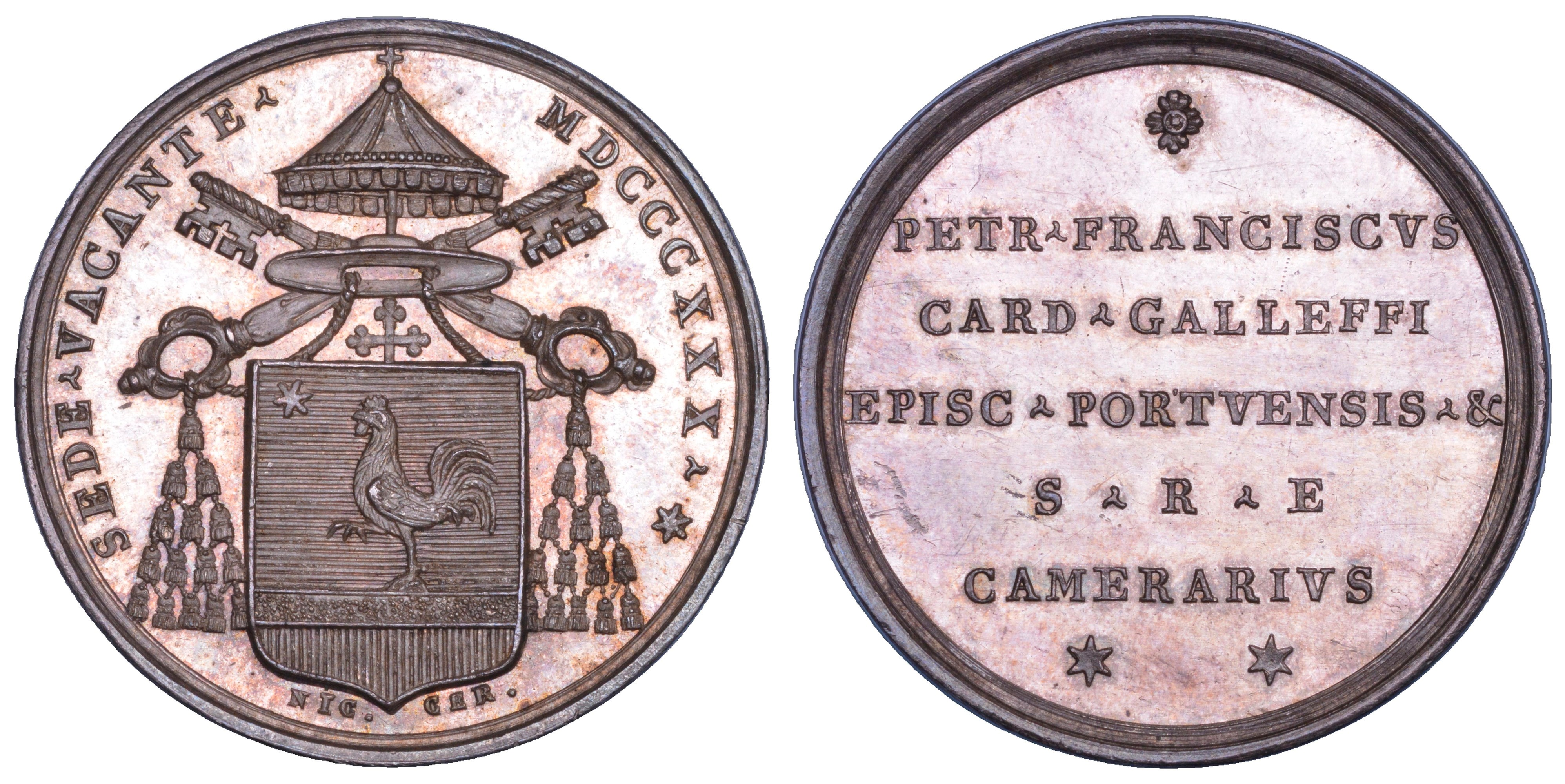 Stemma del Cardinale Camerlengo Pier Francesco Galleffi sormontato dal padiglione e dalle chiavi decussate. R/ PETR FRANCISCVS CARD GALLEFFI EPISC PORTVENSIS & S R E CAMERARIVS su cinque righe tra fiore a quattro petali in alto e due stelle a sei punte in basso. Opus N. Cerbara. Boccia 92. Bartolotti p. 252. Patrignani 129. Rara. g. 14,86. Diam. mm. 31,36. Arg. SPL/FDC