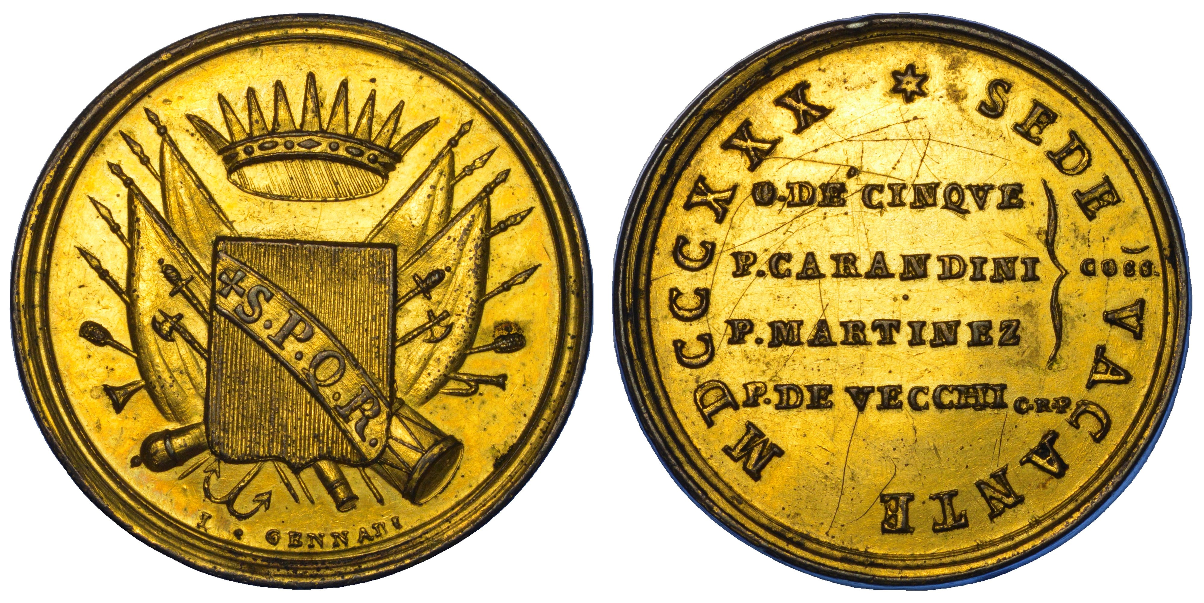 Stemma della Città di Roma con all'interno la scritta S P Q R e sovrapposto a bandiere ed emblemi militari. R/ Nel giro, SEDE VACANTE MDCCCXXX. All'interno, O DE' CINQUE P CARANDINI P MARTINEZ P DE VECCHI C R P su quattro righe, di cui le prime tre tra parentesi graffa. Opus L. Gennari. Boccia 96. Bartolotti p. 252. Patrignani 138. Rara. g. 17,68. Diam. mm. 32,71. Bronzo dorato. Graffi. SPL