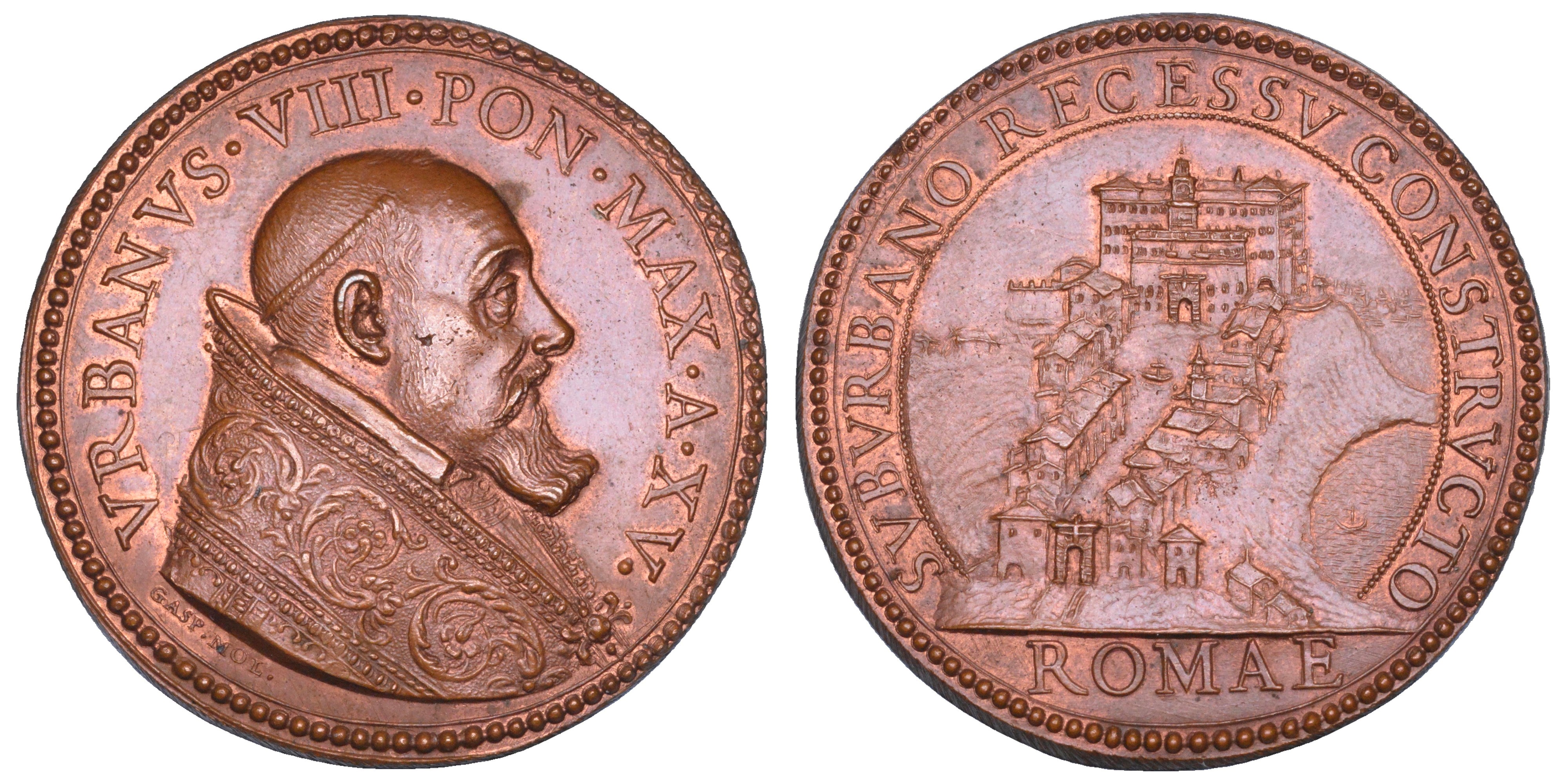 VRBANVS VIII PON MAX A XV Busto a d. con piviale ornato a fioroni e chiuso da fibbia. R/ SVBVRBANO RECESSV CONSTRVCTO Vista di Castelgandolfo con il Palazzo papale in esergo, ROMAE. Opus G. Mola. Modesti 105. Bart. E638. Miselli 297. Rara. g. 28,87. Diam. mm. 41,40. Bronzo. q.FDC