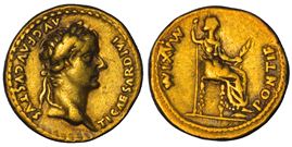 Testa laureata a d. R/ La Pax-Livia seduta a d. tiene lungo scettro verticale e ramo di ulivo. Coh. 15. BMC 46. RIC 29. Calicó 305b. g. 7,65. Diam. mm. 18,92. Oro. q.BB