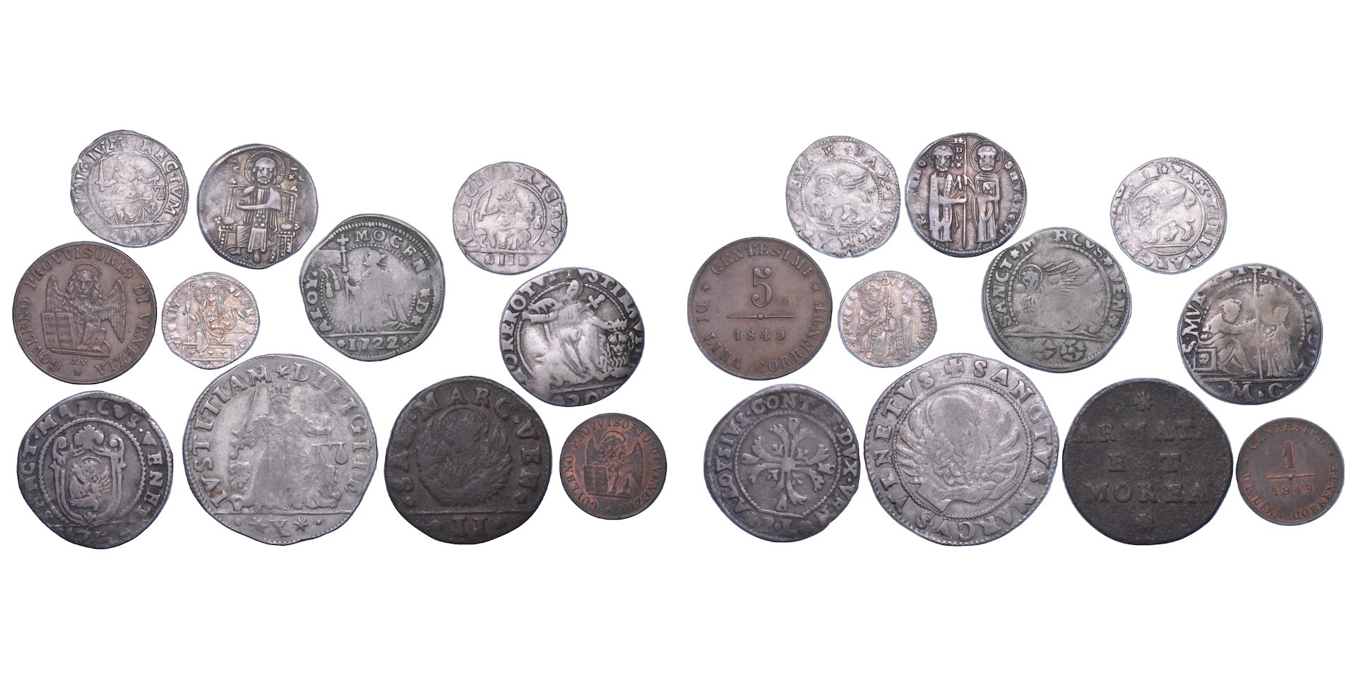 Monetazione mista coniata dal XIII al XIX secolo. Si segnalano emissioni dei dogi Zeno Ranieri, Andrea Dandolo, Alvise I Mocenigo, Alvise Contarini e Alvise III Mocenigo. Presenti anche alcune emissione anonime dei dogi. Esemplari in argento e rame. conservazioni da B/MB a BB/q.SPL.