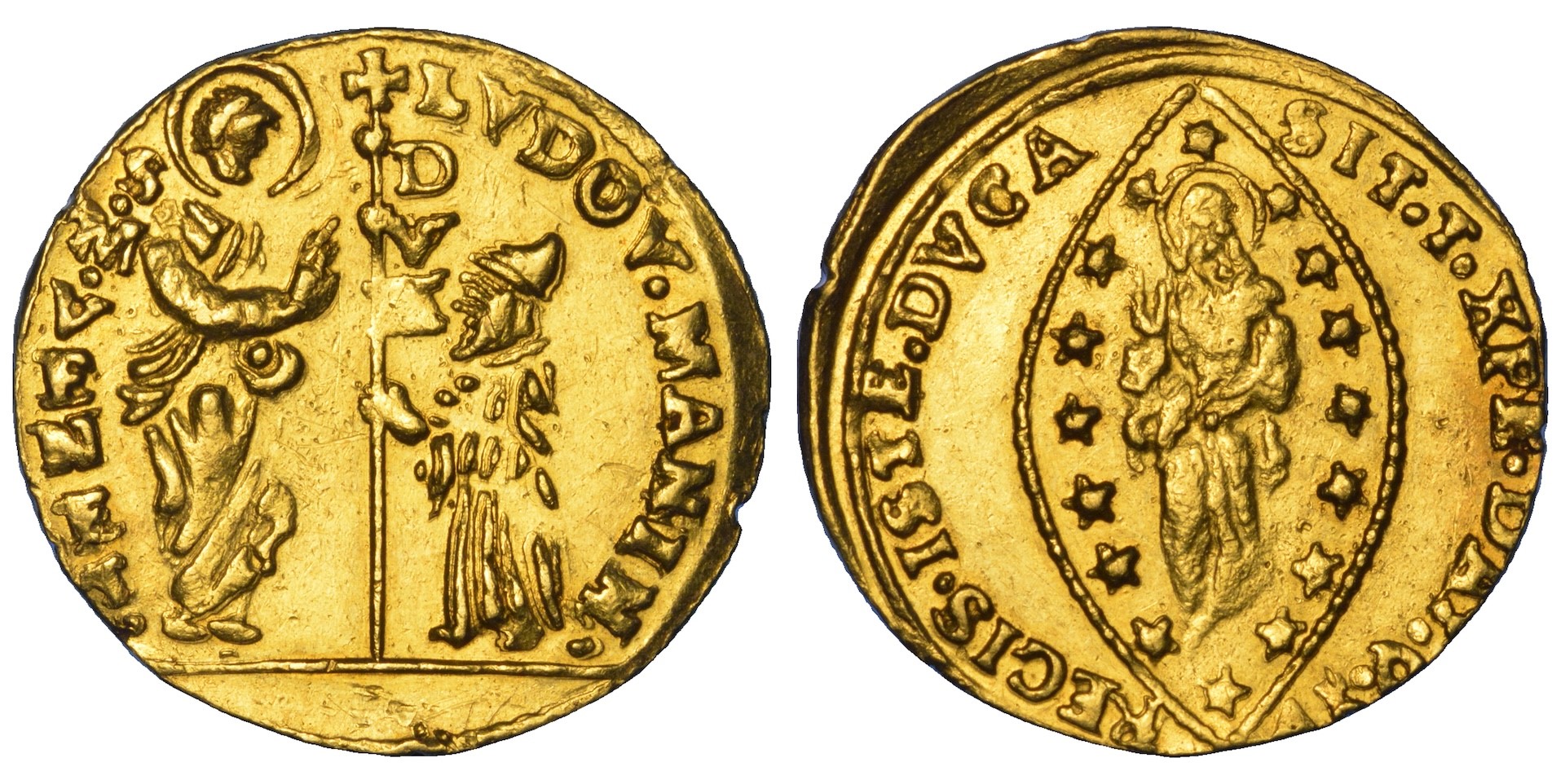 S. Marco in piedi porge il vessillo al doge genuflesso. R/ Il Redentore entro mandorla. Paol. 14. g. 3,49. Diam. mm. 21,18. Oro. Tracce di montatura. BB