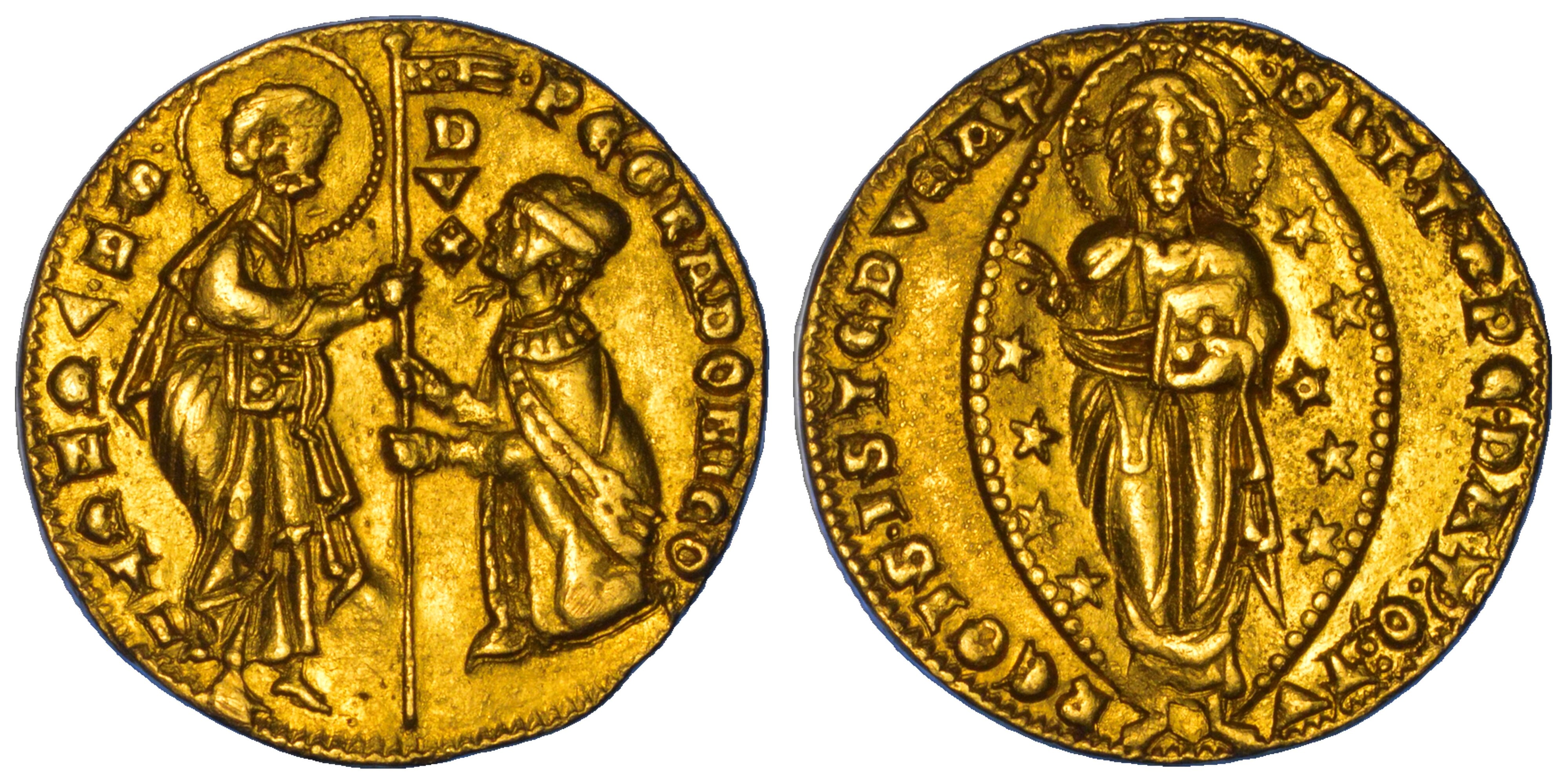 PE GRADONIGO S M VENETI DVX S. Marco, in piedi, porge il vessillo al doge genuflesso. R/ SIT T XPE DAT Q TV REGIS ISTE DVCAT Il Redentore in piedi entro aureola ellittica. Paol. 1. Raro. g. 3,54. Diam. mm. 19,44. Oro. Lieve granulosità da tondello arrugginito BB