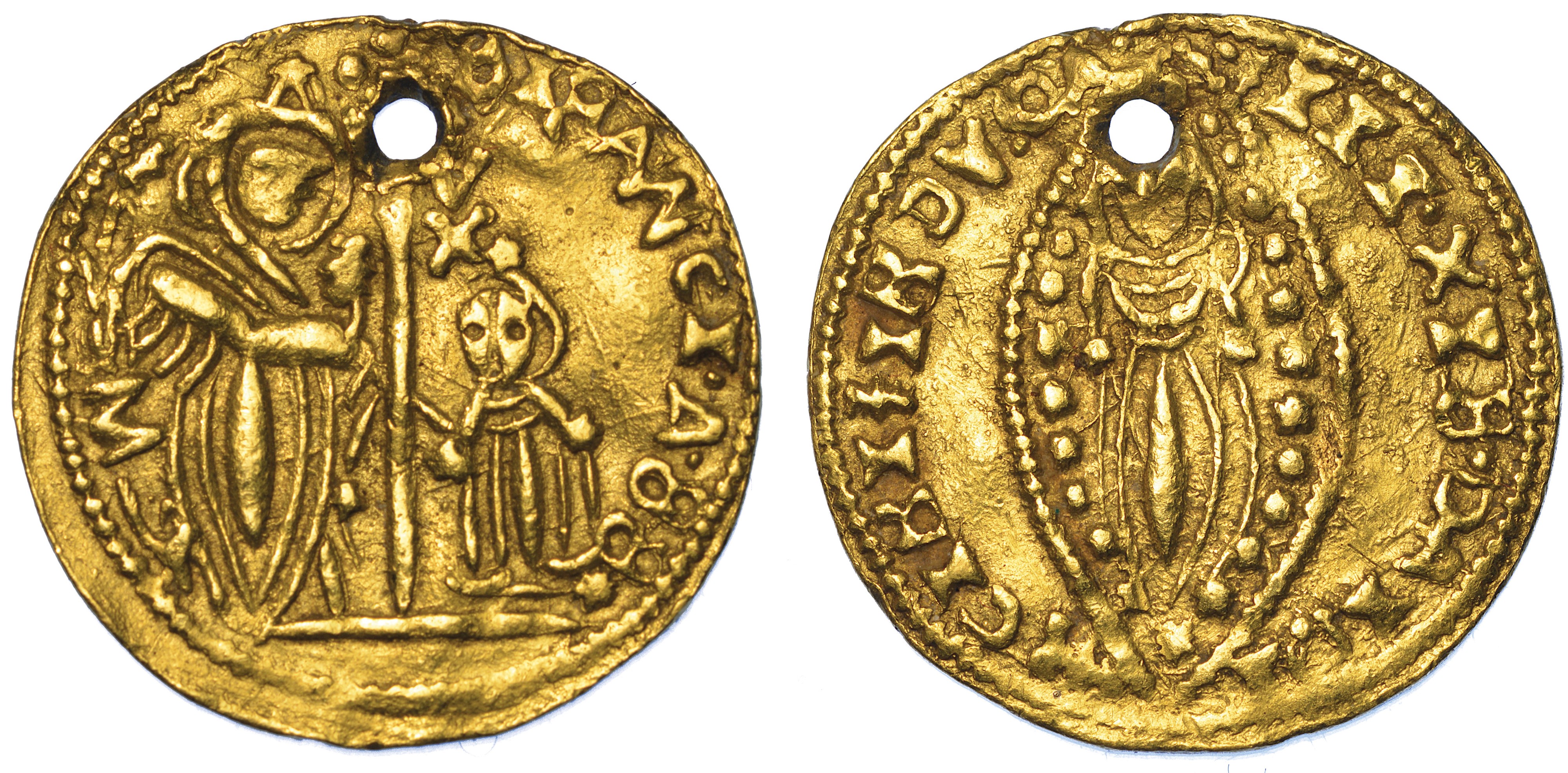 il Santo in piedi porge il vessillo al doge genuflesso. R/ Il Redentore in piedi in aureola ellittica. Gamb vedi tipo 415. g. 2,93. Diam. mm. 19,97. Oro. Forato. MB/BB