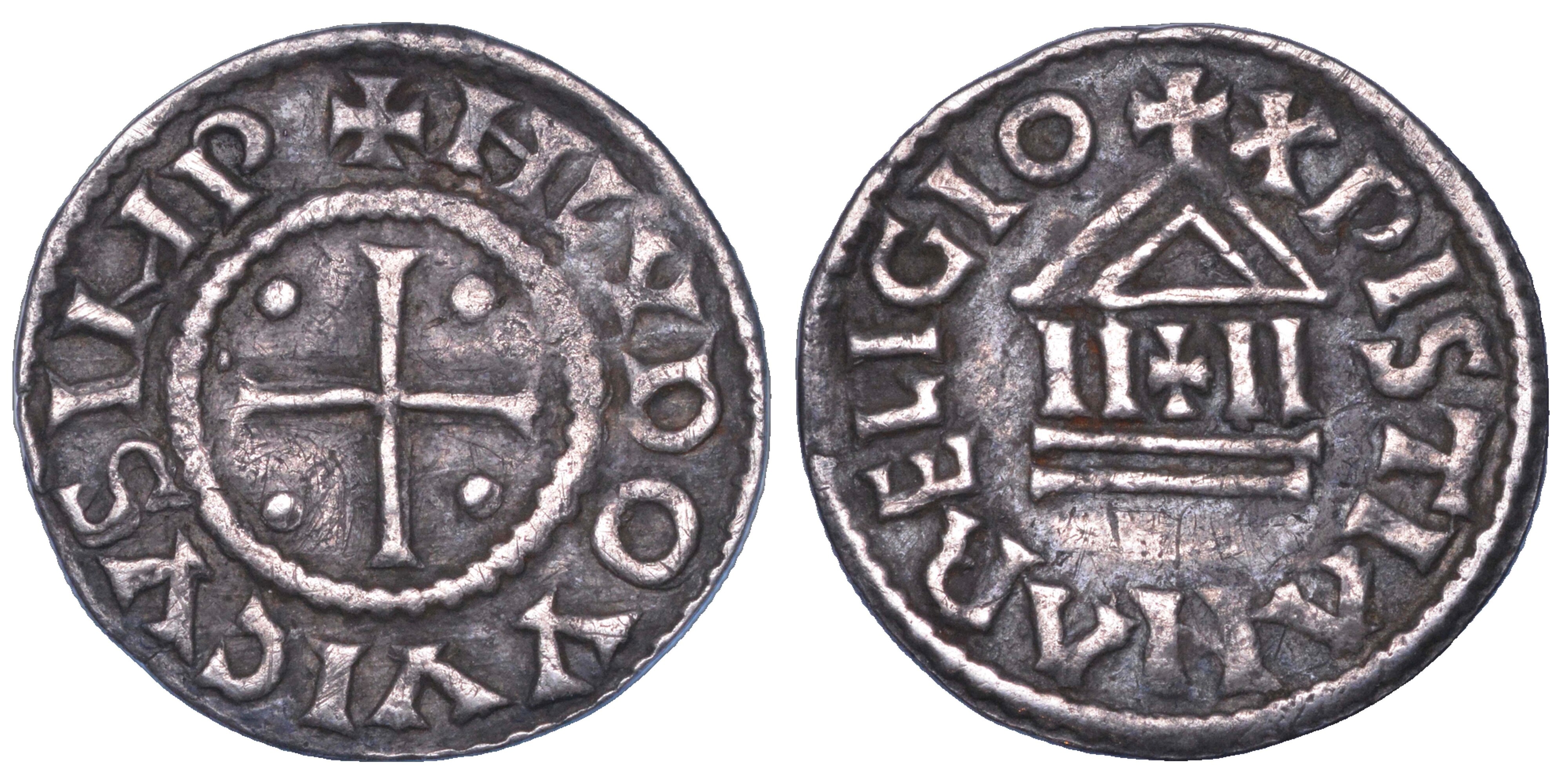 HLVDOVICVS IMP Croce con lunghe braccia, accantonata da quattro grossi globetti. R/ XPISTIANA REIICIO Tempio tetrastilo su due gradini, con croce nel mezzo. Crippa pagg. 78-79. MEC, 1007. MIR 9/1 (Milano - denaro piano). Molto raro. g. 1,54. Diam. mm. 19,64. Arg. BB
