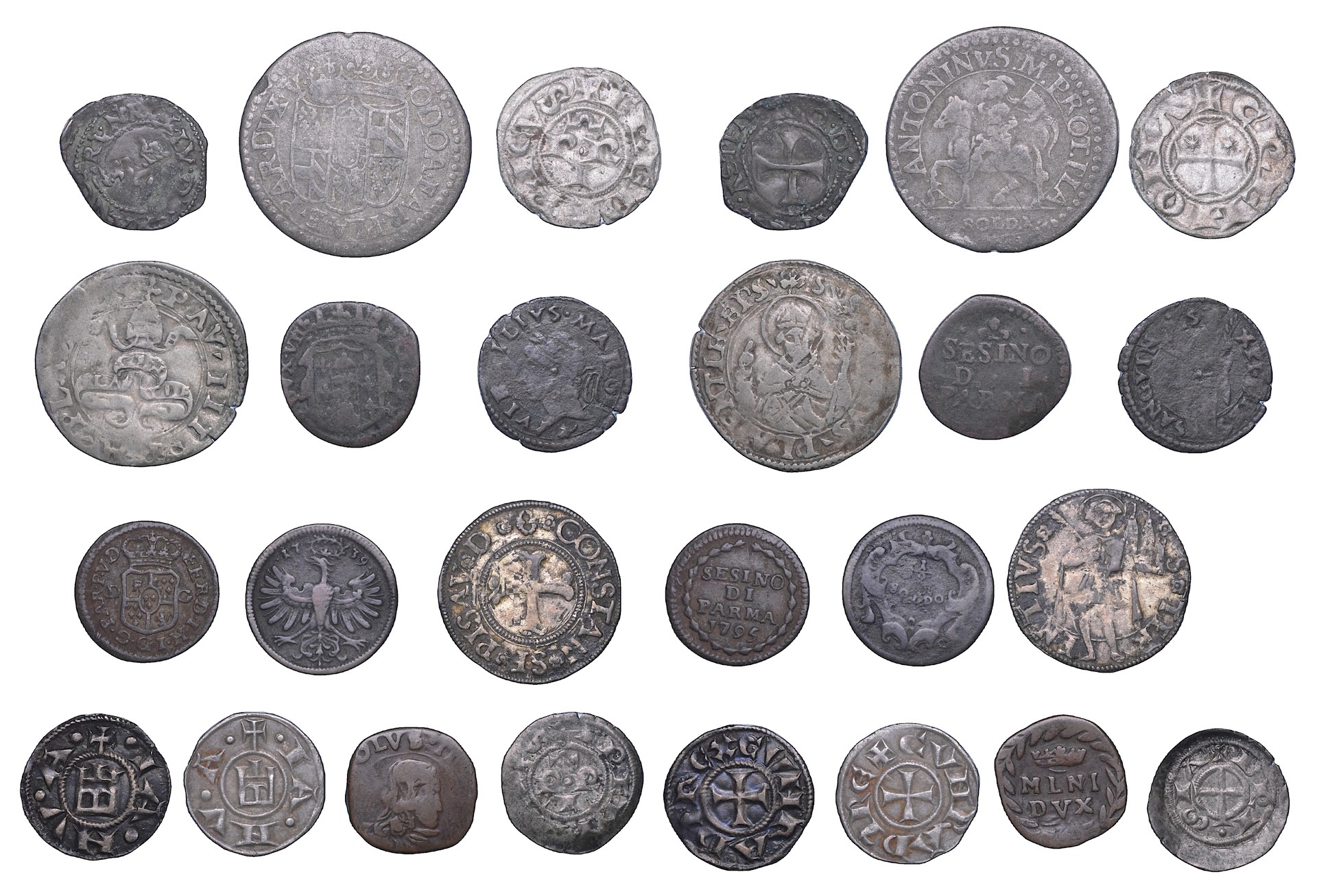 Monetazione mista coniata dal XII al XVIII secolo a Asti, Brescia, Cremona, Genova, Mantova, Milano, Parma, Pesaro, Piacenza e Trento. Esemplari in rame e mistura. Conservazioni da B/MB a BB.