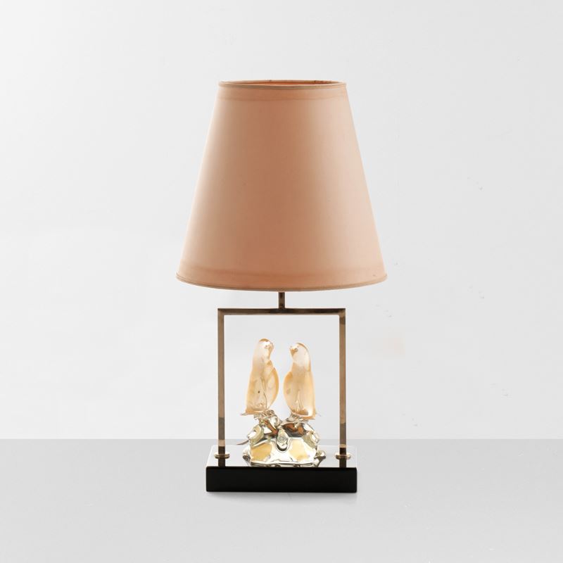 Struttura in ottone e vetro di Murano con inclusioni in oro, base in legno laccato e paralume in tessuto.